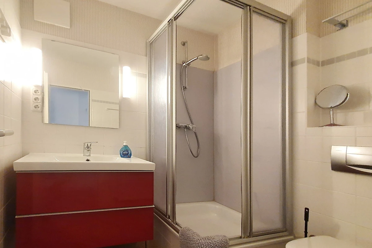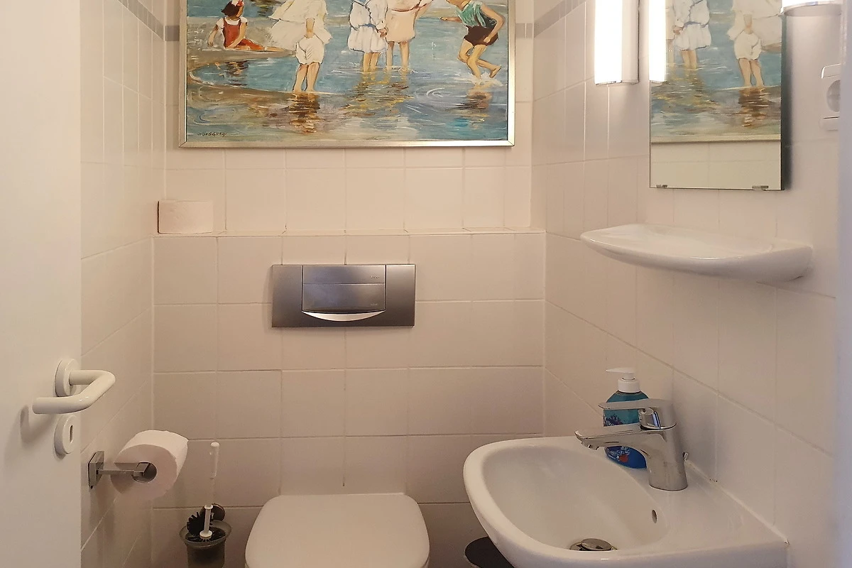 Neben dem Bad mit Dusche, einen Waschtisch mit ausreichend Platz für Ihre Kosmetikartikel und ein WC, gibt es noch ein zusätzliches Gäste-WC mit kleinen Handwaschbecken.