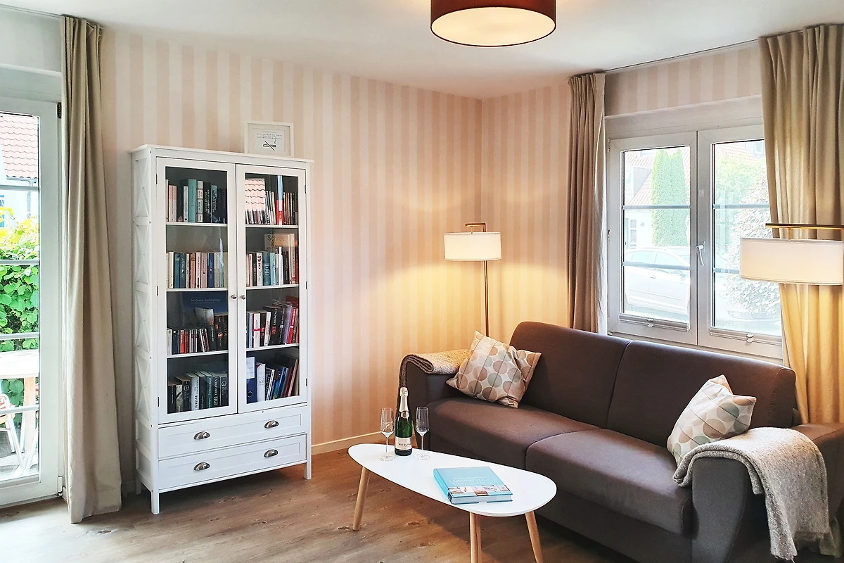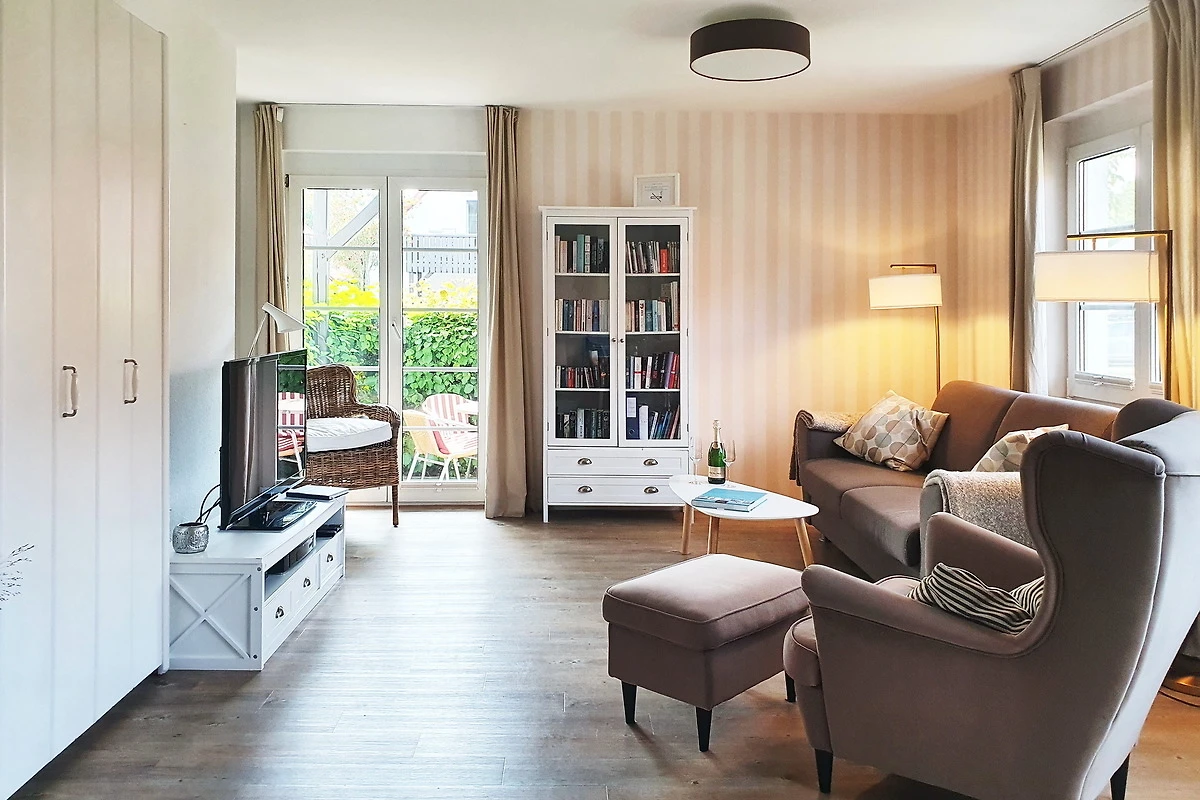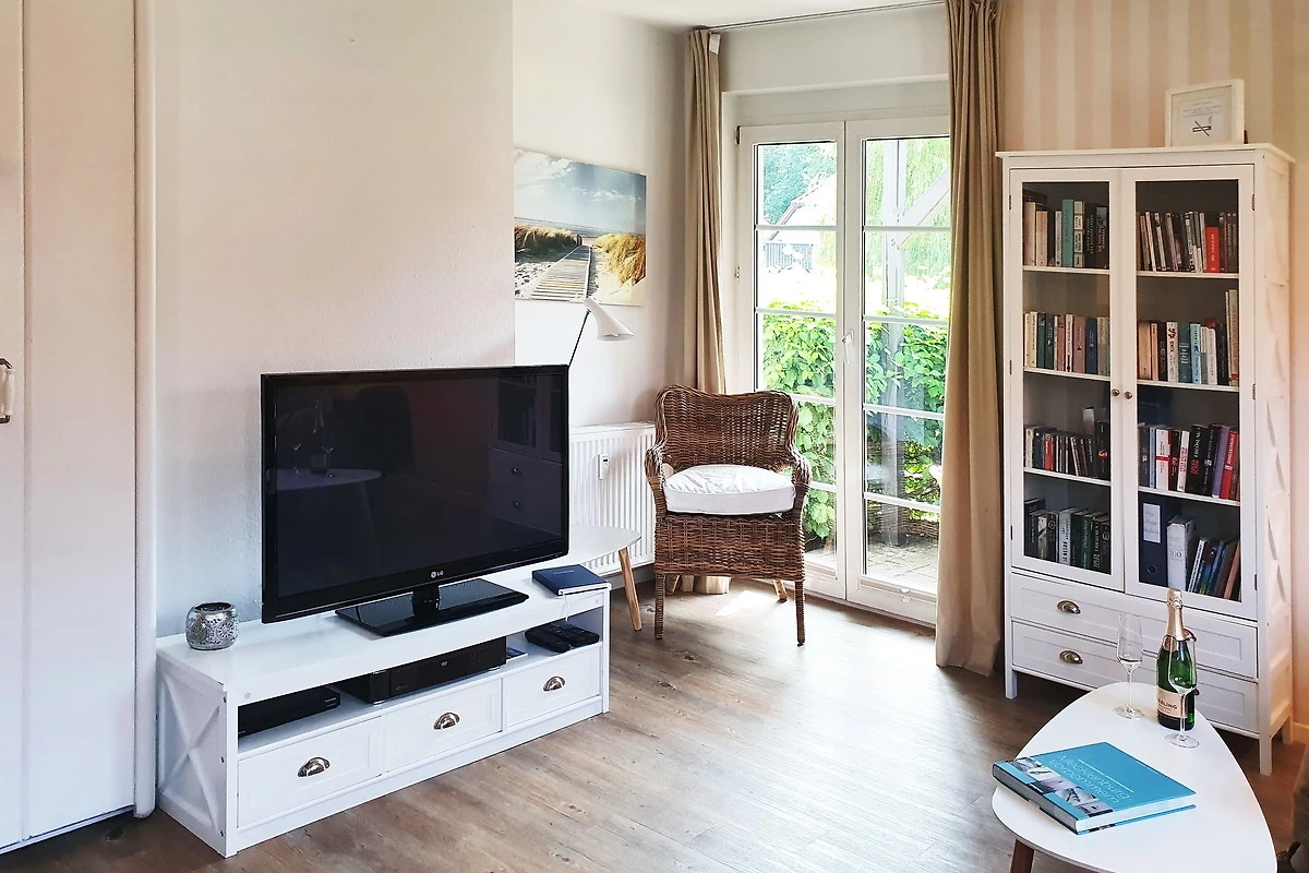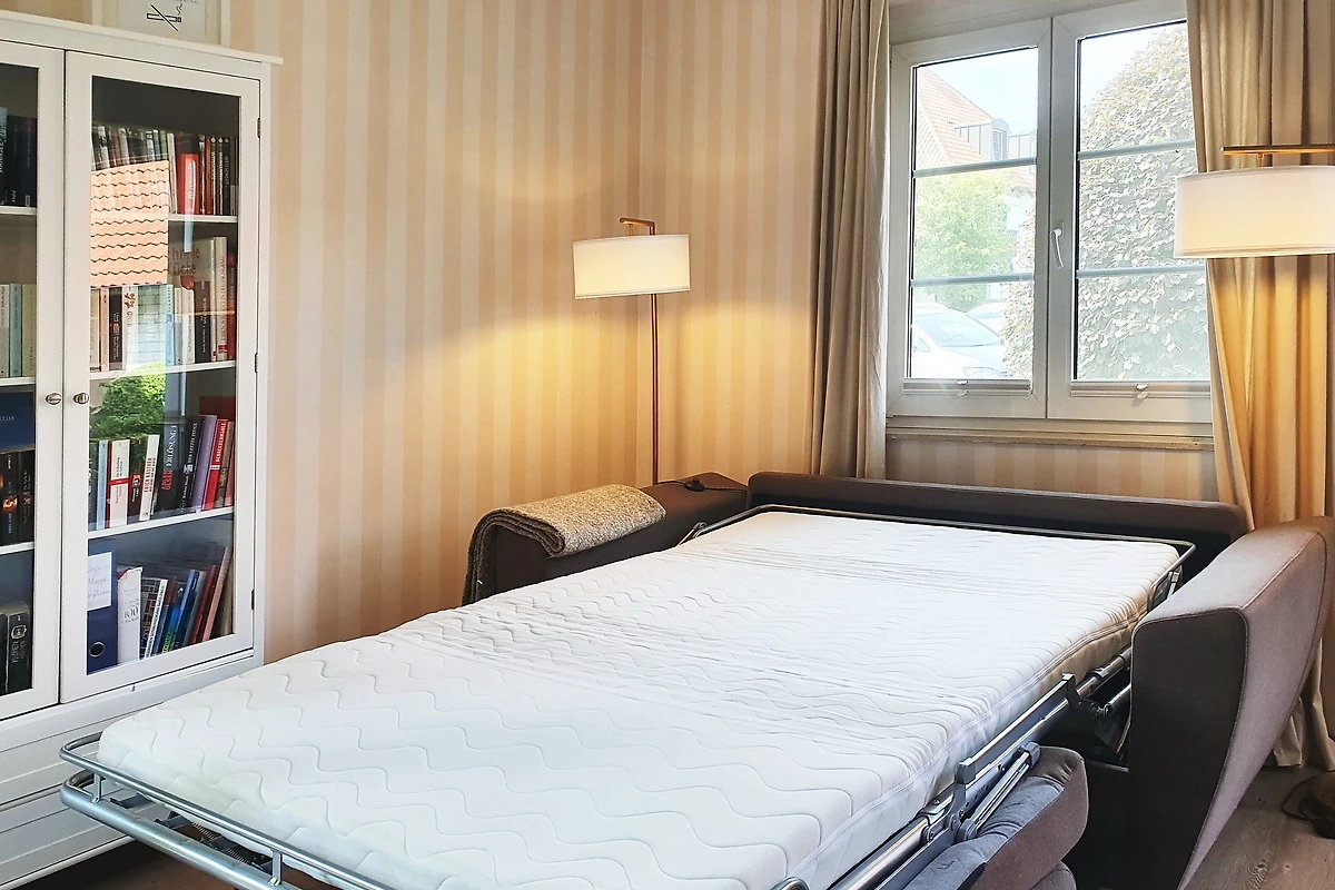 Der grosszügige Wohnraum mit geräumigem Essbereich und offener Küche ist mit einem bequemen Sofa (auch als Schlafcouch mit komfortabler Kaltschaummatratze 1,60 x 2,00 m zu benutzen), einem grossen Flachbildschirm TV, DVD-Player, Musikanlage, einer kleinen gut sortierten Bibliothek und Videothek und einer Verdunklungsmöglichkeit eingerichtet.