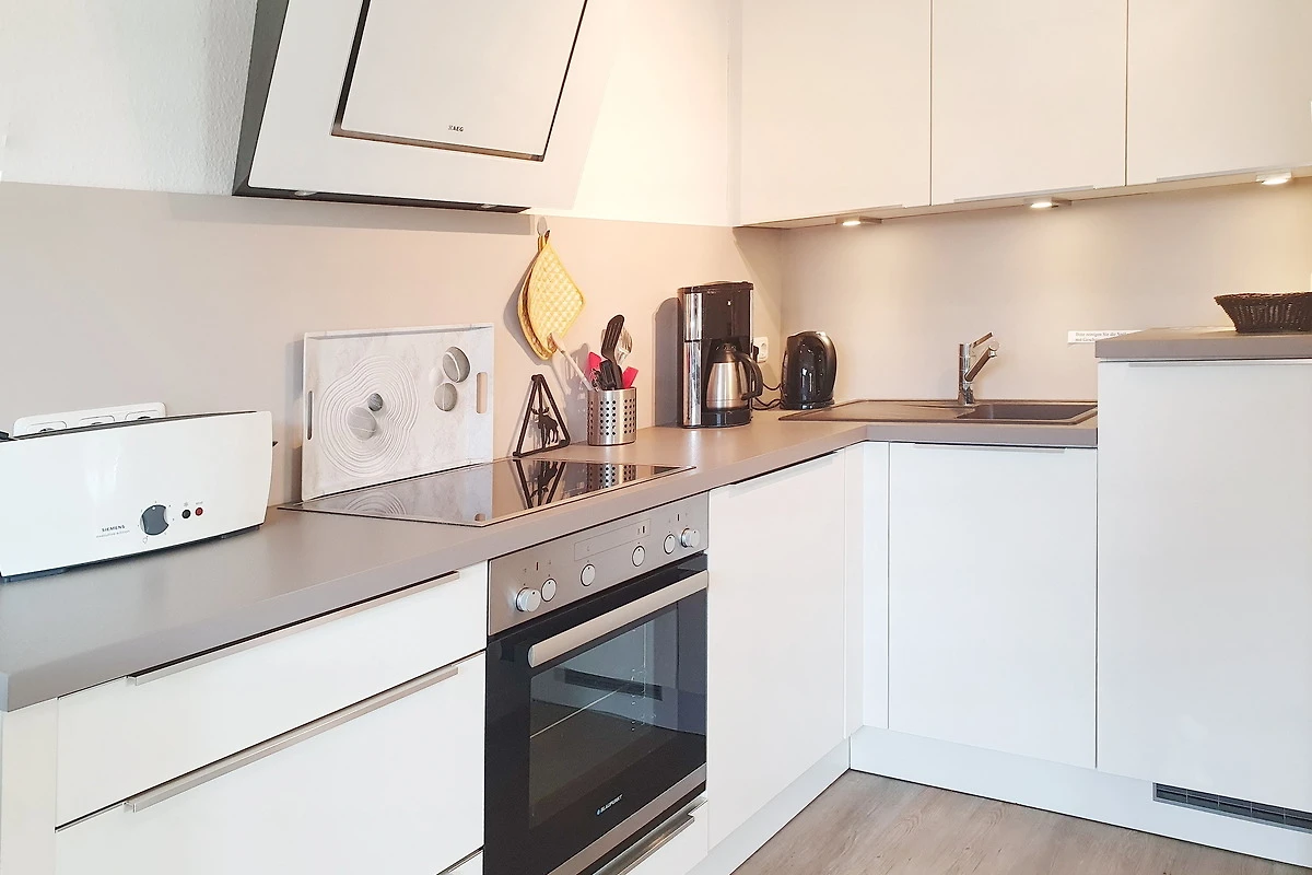 In der neuen, weissen, qualitativ hochwertigen Küche helfen Ihnen folgende Geräte bei der Zubereitung Ihrer Mahlzeiten: Geschirrspüler, Ceranfeld, Backofen mit Grill, geräumiger Kühlschrank mit Gefrierfach, Kaffeemaschine, Wasserkocher, Toaster, Wärmegerät für Babynahrung, Mixer, Pürierstab und ausreichend Geschirr.