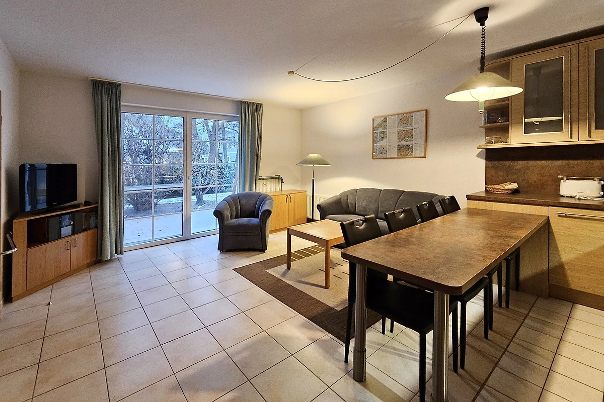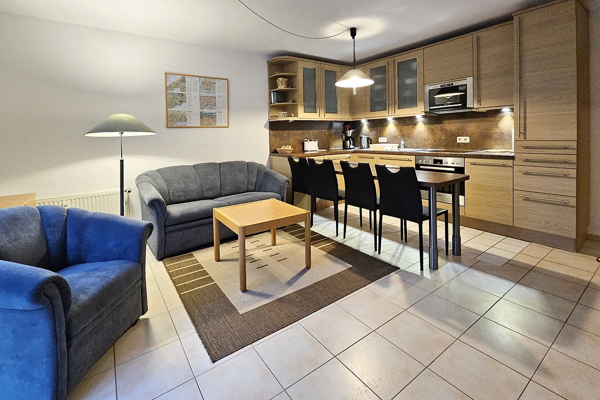 Die Ferienwohnung im 1. OG besteht aus einem Raum mit Wohn- und Küchenbereich mit Esstisch und kleiner Pantryküche, sowie einem Schlafbereich mit Doppelbett.