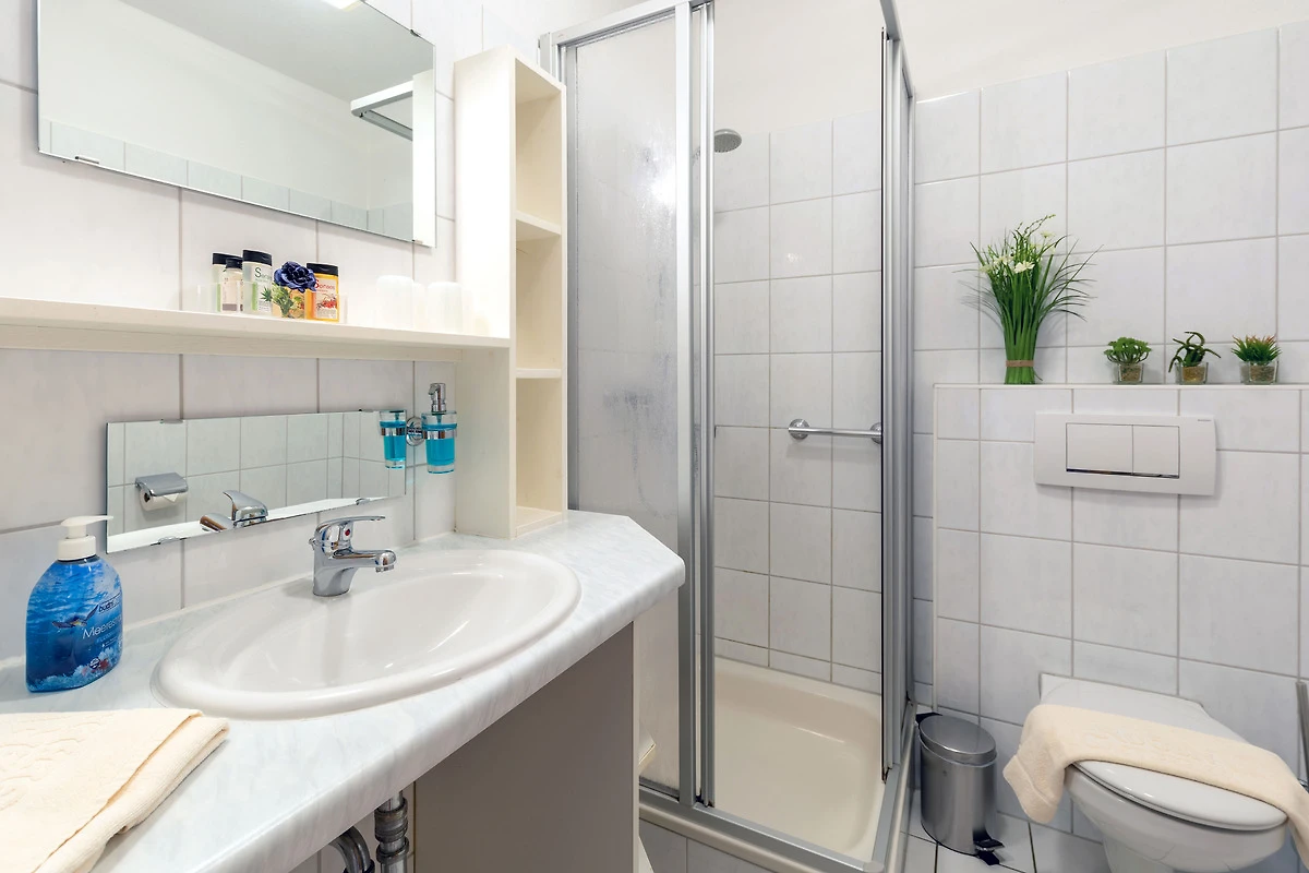Das Badezimmer ist mit einer Dusche und WC ausgestattet. In den Schränken haben Sie genügend Stauraum für Ihre Wasch- und Kosmetikutensilien.