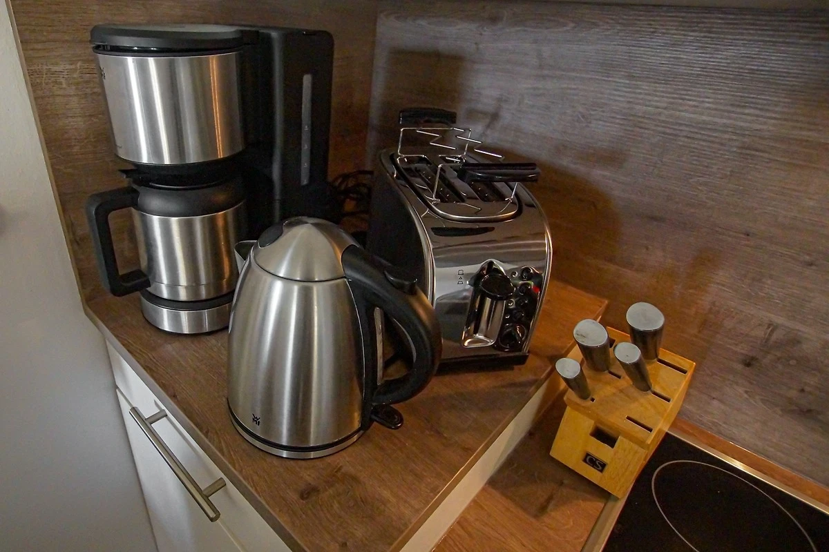 Die hier angrenzende Küchenzeile ist mit einem Kühlschrank mit Gefrierfach, einem Geschirrspüler, einem Backofen mit Cerankochfeld und einer Mikrowelle ausgestattet. Eine Kaffeemaschine, ein Toaster, ein Eierkocher und ein Wasserkocher stehen Ihnen hier selbstverständlich zur Verfügung.