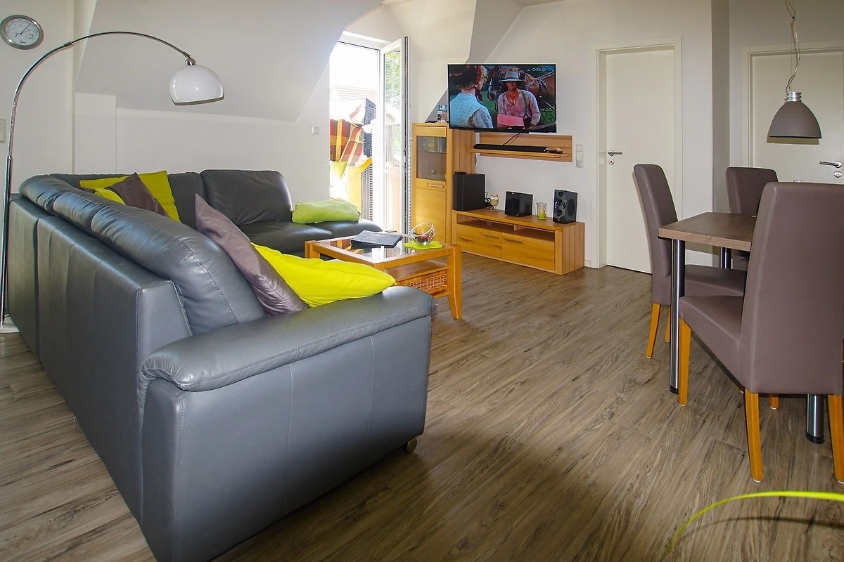 Die 60 m ² grosse und mit 4 DTV Sternen klassifizierte Ferienwohnung 06 Strandlust befindet sich im Dachgeschoss im Haus Sonne. Sie bietet mit ihren drei Zimmern ausreichend Platz für bis zu 5 Personen.