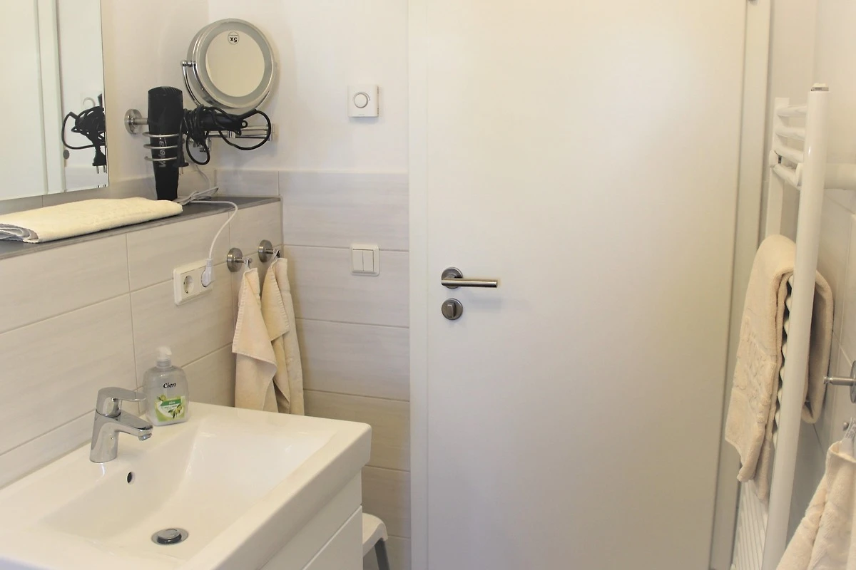Das Badezimmer ist mit einer Regenwasserdusche und WC ausgestattet. Im Schrank haben Sie genügend Stauraum für Ihre Wasch- und Kosmetikutensilien. Ein Duschhocker und Föhn ist ebenfalls vorhanden.