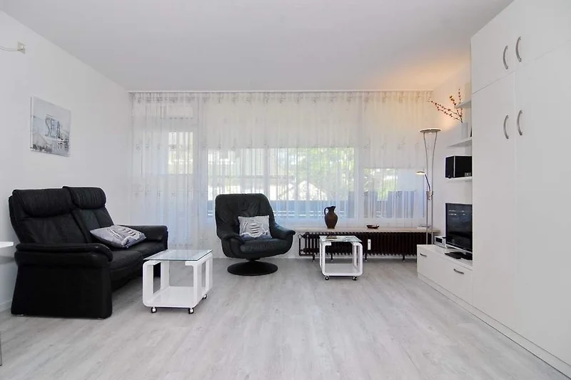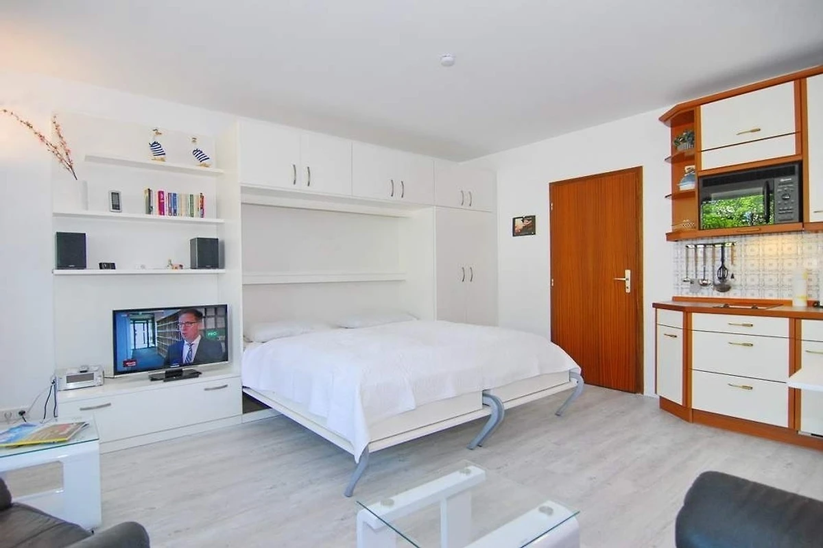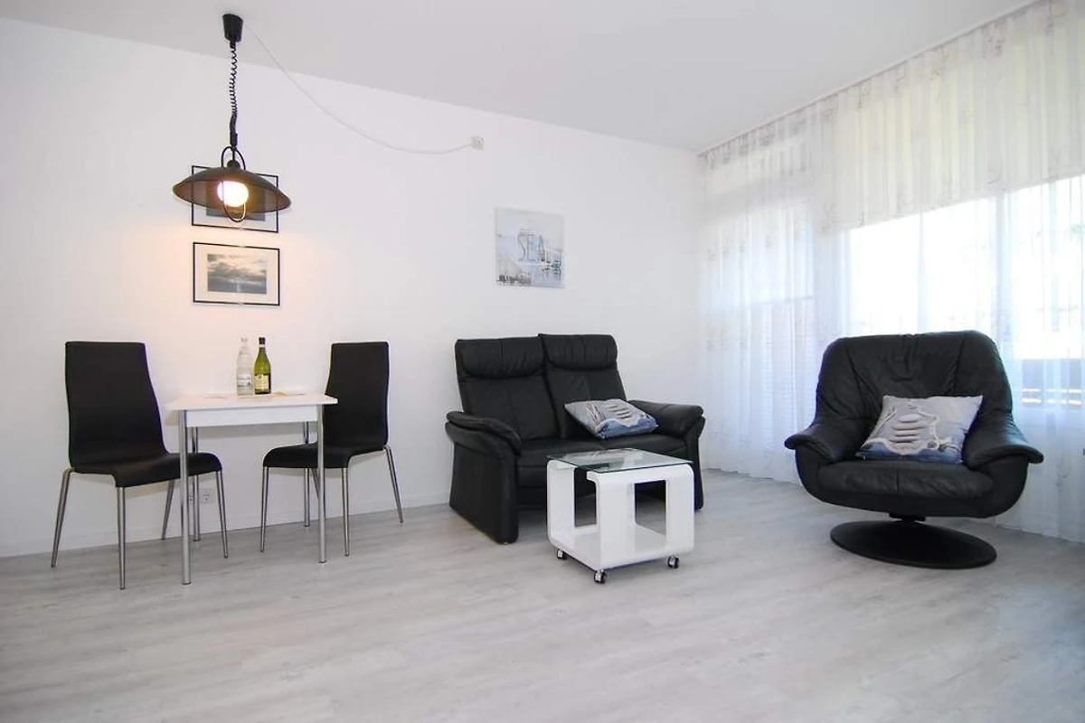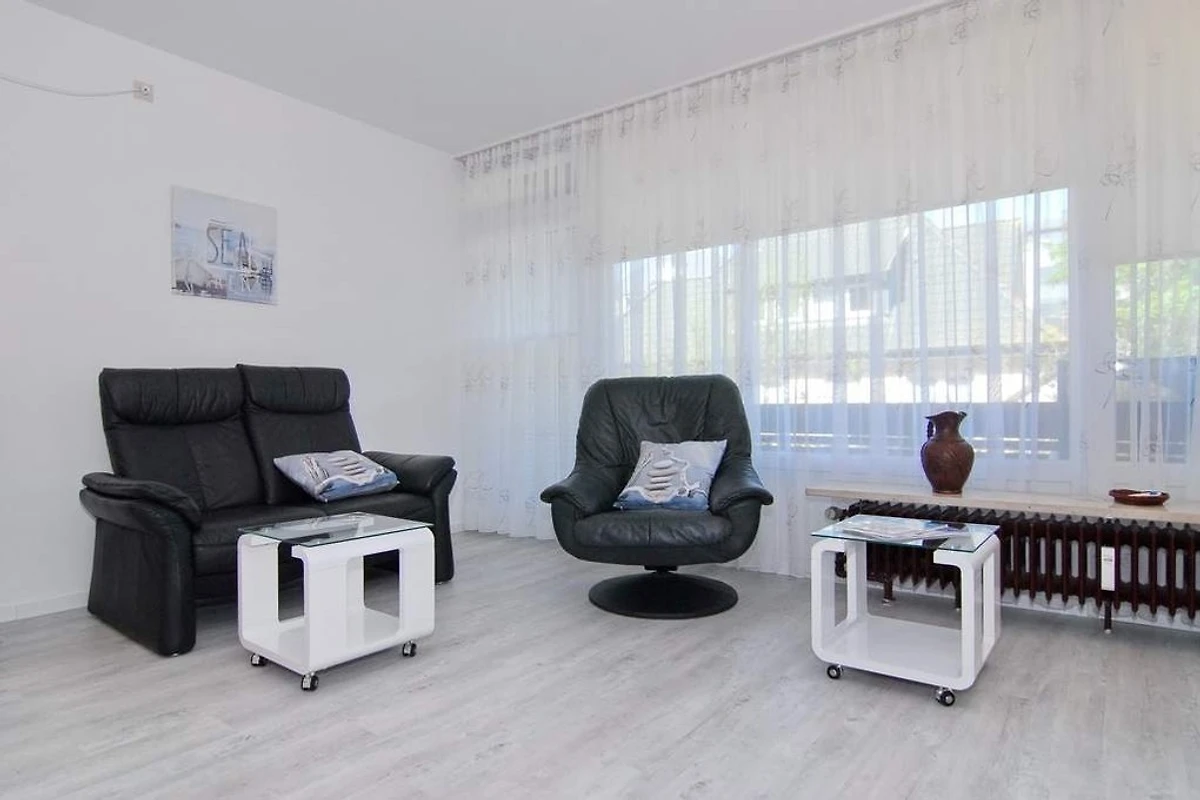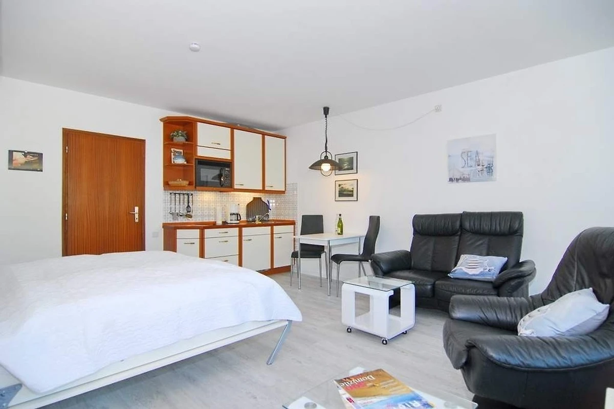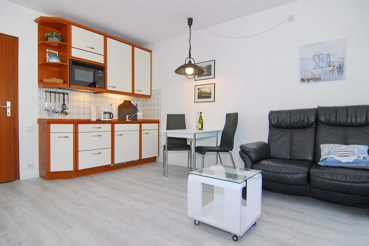 Komplett sanierte 1-Zimmer-Ferienwohnung, ca. 36 qm, EG, Nichtraucher-Wohnung! Wohnraum mit 2 Einzelschrankbetten (2x90x200cm), Zweizitzer-Sofa und Sessel, Beistelltische, Flat-TV, Radio, W-LAN ( ohne Gewähr ), Essplatz, Küchenzeile mit Mikrowelle, möblierter Westbalkon. Dusche / WC, Abstellraum, Waschmaschine und Trockner im Haus, PKW-Stellplatz Nr. 10, Fahrradabstellmöglichkeit draussen am Haus vorhanden. Bettwäsche und Handtücher sind zur Anreise aufgezogen. Fahrstuhl hält zwischen den Etagen! Tierhaltung generell verboten ! Auf dem nördlich angrenzenden Nachbargrundstück entsteht ab Mai 2024 ein Neubauvorhaben. Hier kann es zu Lärmbelästigung kommen.