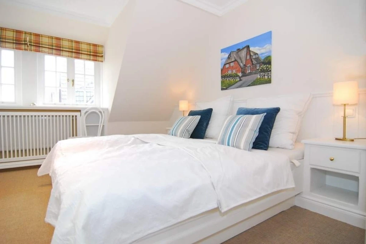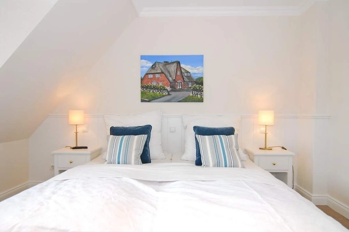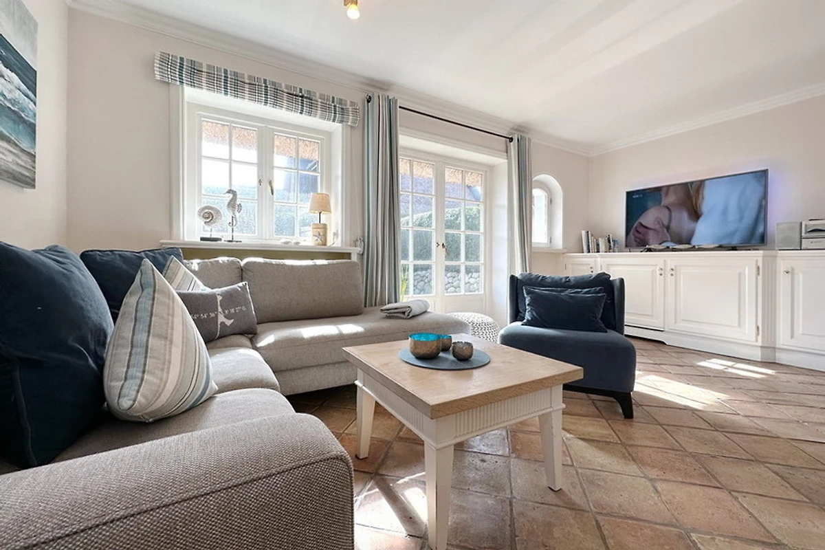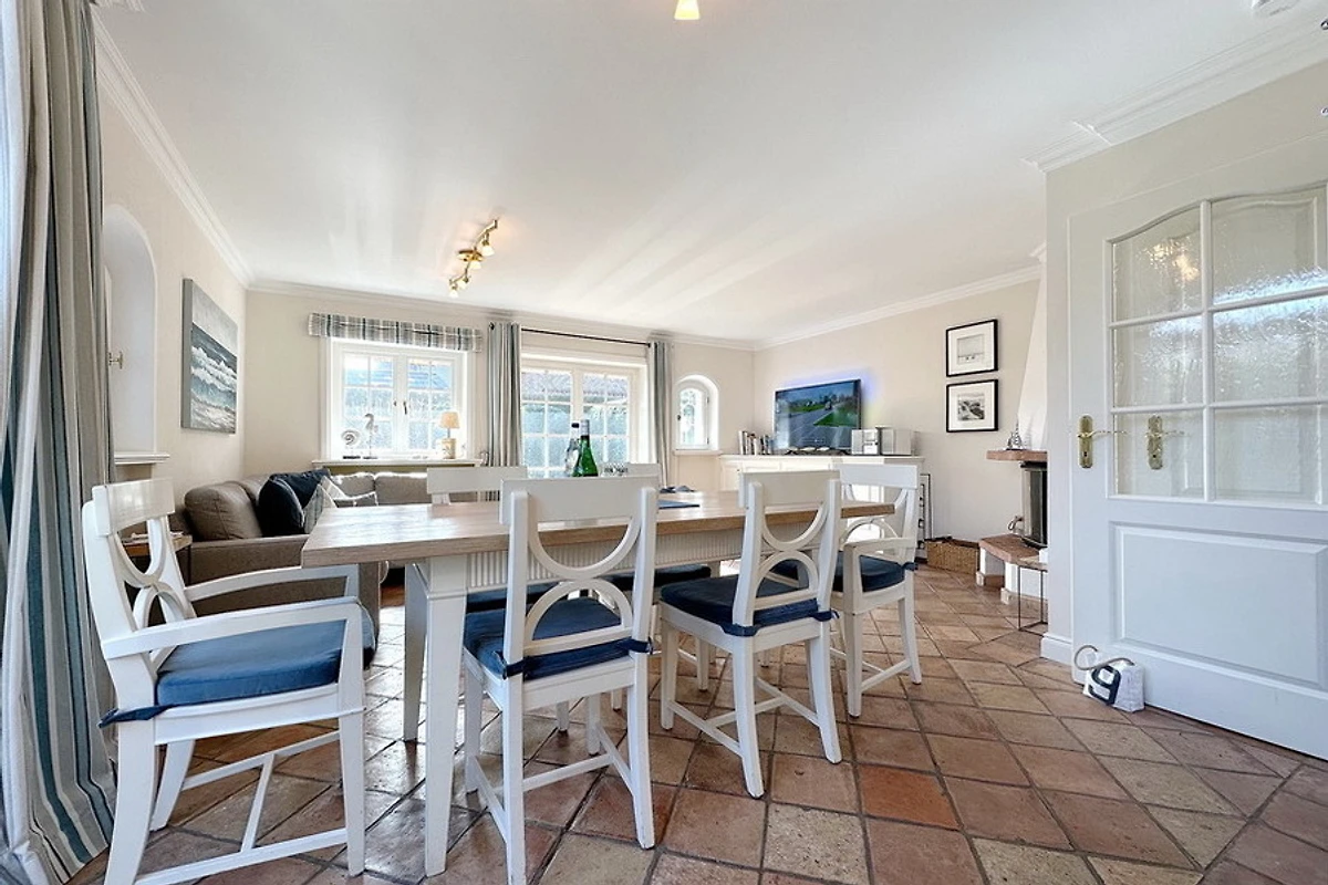 Exklusive Doppelhaushälfte am Ortsrand von Tinnum mit Süd- und Ostterrasse unter Reet. Nichtraucher. EG: Sonniges Wohnzimmer mit Essplatz, Kamin und Couchecke, TV, DVD, Stereoanlage, CD, MP3, Internet (ohne Gewähr), Telefon (Festnetzflatrate), Terrasse mit Gartenmöbeln und Strandkorb, Gäste- WC, offene Küche mit Geschirrspüler, Mikrowelle und Backofen, Fussbodenheizung im EG. OG: 2 Schlafzimmer mit 2 Doppelbetten und TV, je 1 Voll- und Duschbad/WC mit Fussbodenheizung. Waschmaschine und Trockner sind im Haus. PKW-Stellplatz am Haus. Tierhaltung und grillen sind verboten. Bettwäsche und Handtücher sind zur Anreise aufgezogen.