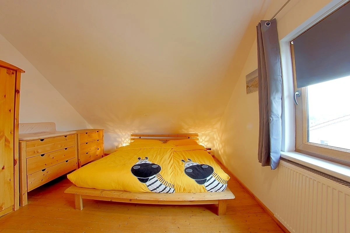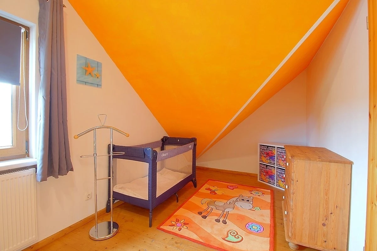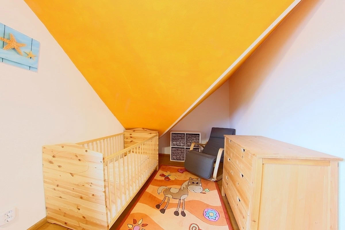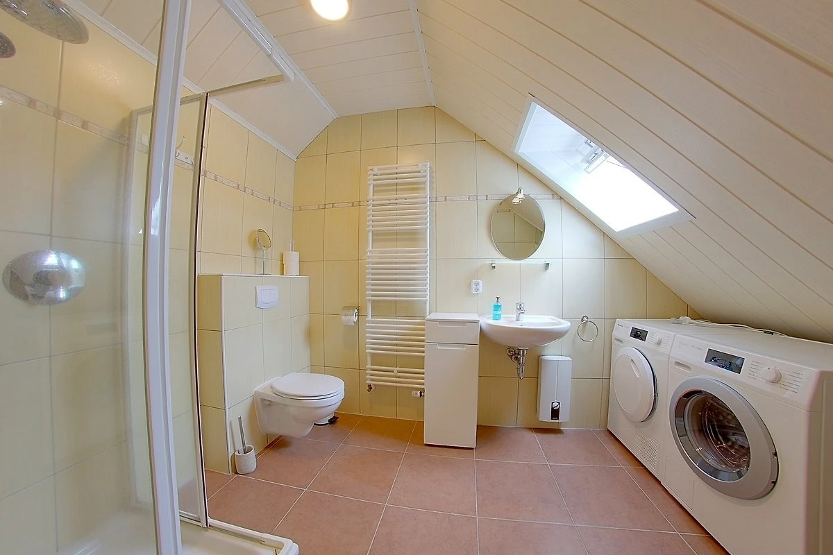 Im Erdgeschoss befindet sich ein modernes Duschbad mit Sauna, sowie ein Schlafzimmer mit Doppelbett (1,80 x 2,00 m). Im Obergeschoss befinden sich zwei weitere Schlafzimmer mit jeweils einem Doppelbett (1,80 x 2,00 m) und ein Kinderbett, sowie einer Wickelauflage. Das Duschbad im Obergeschoss bietet ausserdem eine Waschmaschine und Wäschetrockner für unsere Gäste.