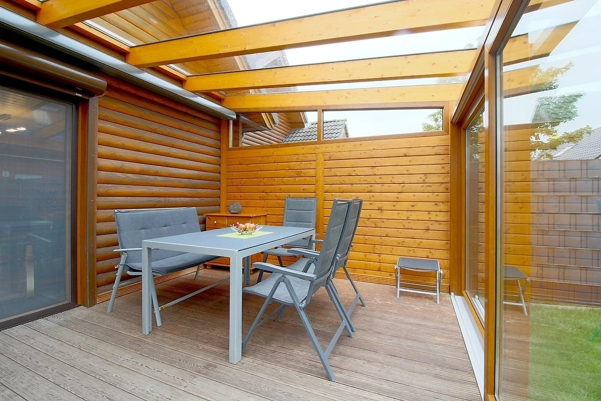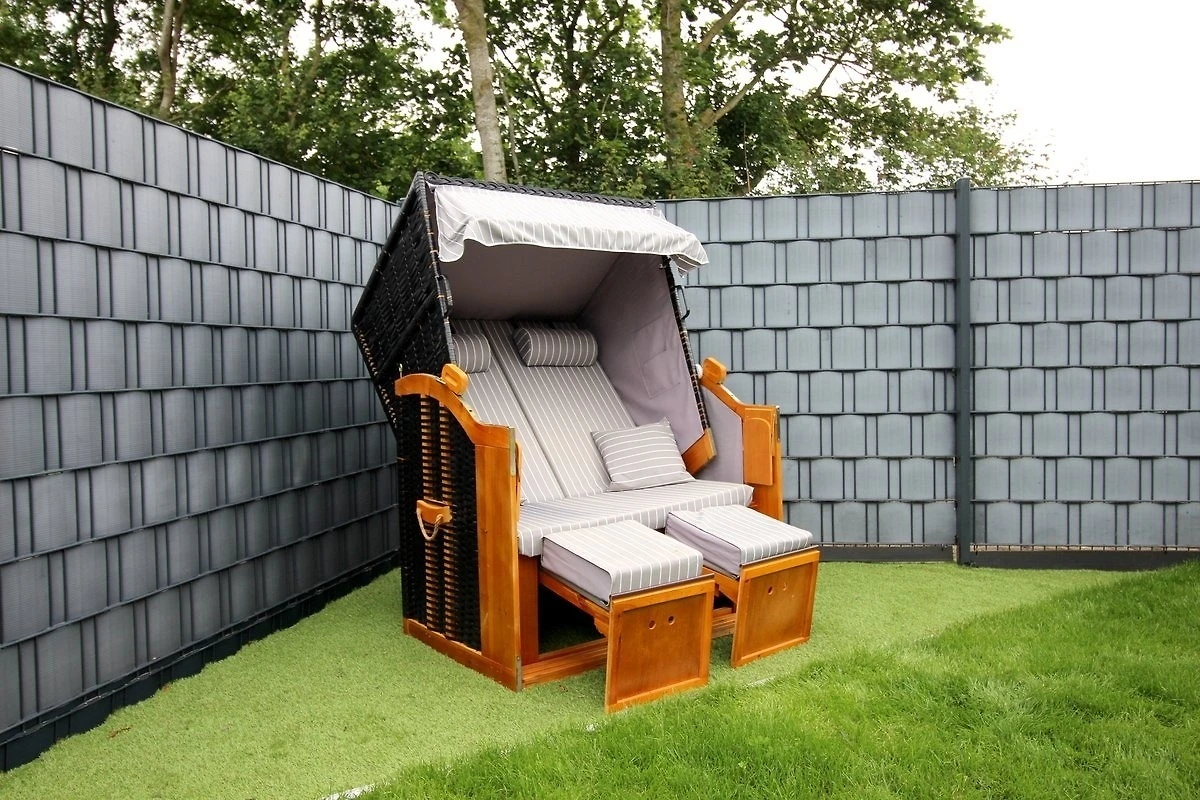 Vom Wohnzimmer aus gelangen Sie auf die grosszügige überdachte Südterrasse mit Gartenmöbeln, Sonnenliegen und Strandkorb. Das Grundstück ist eingezäunt.