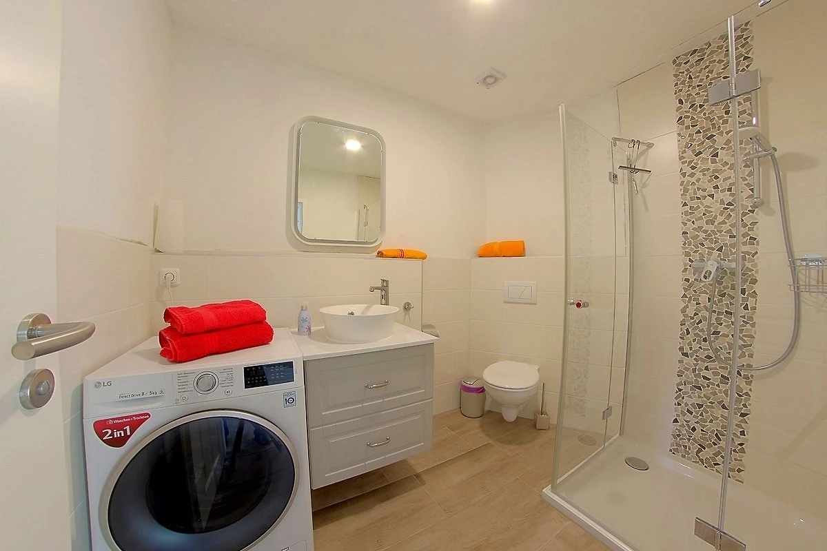 Ein helles, modernes Duschbad mit Waschtrocker steht Ihnen ebenfalls im Erdgeschoss zur Verfügung und im Obergeschoss ein separates WC.