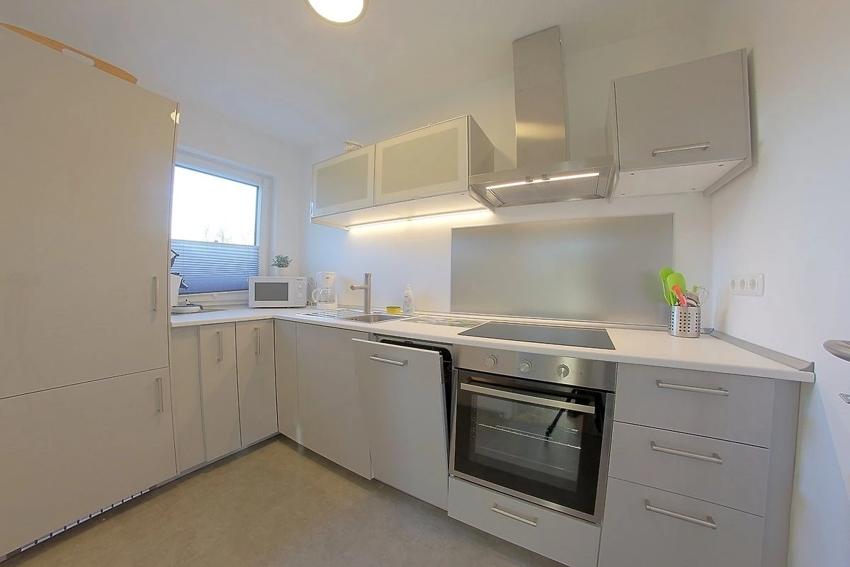 Im 2019 fertiggestellten, modern gestalteten Haus gibt es im Erdgeschoss einen Wohn-, Essbereich mit Flat-TV und Ausgang zur Terrasse. Die hochwertige Küche mit komplett ausgestatteter moderner Einbauküche wird die Hobbyköche erfreuen. Alle Räume sind mit pflegeleichtem Vinylboden in Holzoptik ausgestattet. Kostenloses W-Lan steht den Gästen zur Verfügung.