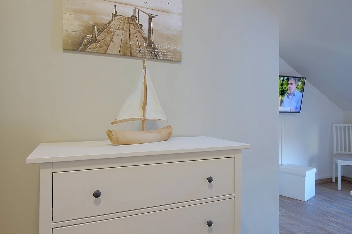 Im Obergeschoss befinden sich zwei Schlafzimmer, eins mit Doppelbett (1,80 x 2,00 m) und TV, sowie ein Schlafzimmer mit zwei Einzelbetten ( 0,90 x 2,00 m) und ebenfalls TV.