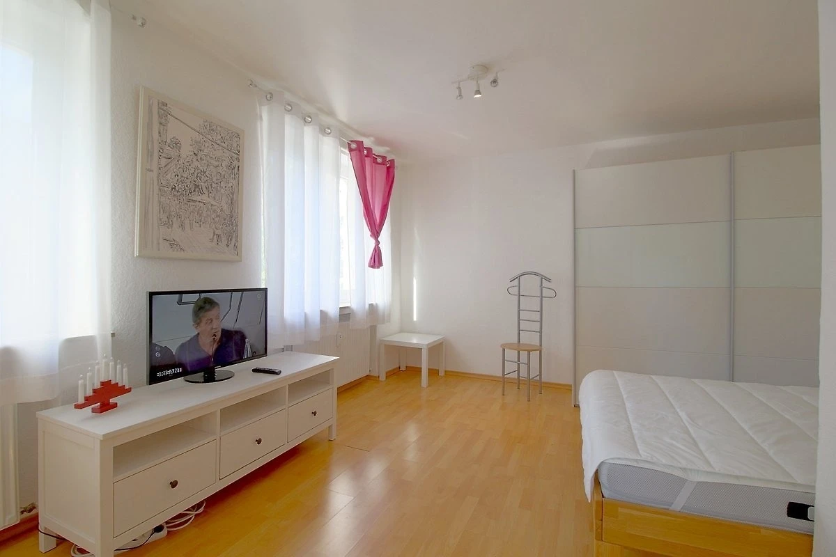 Der Wohn- und Schlafbereich verfügt über ein kleines Sofa, Flachbild TV, ein französisches Bett (1,40 x 2,00m), einen geräumigen Kleiderschrank und Ausgang zum kleinen Balkon.