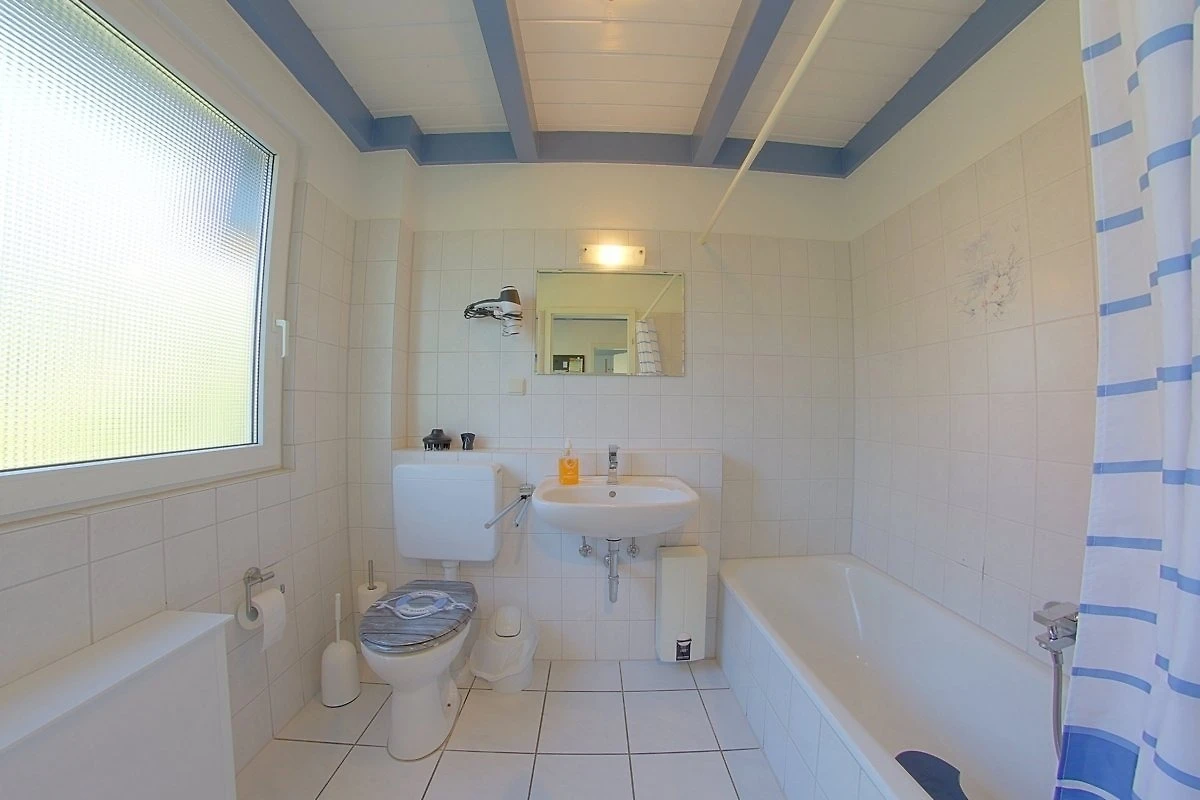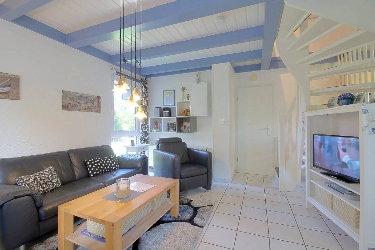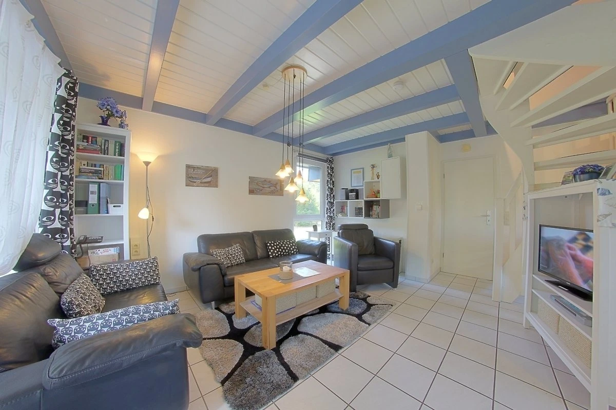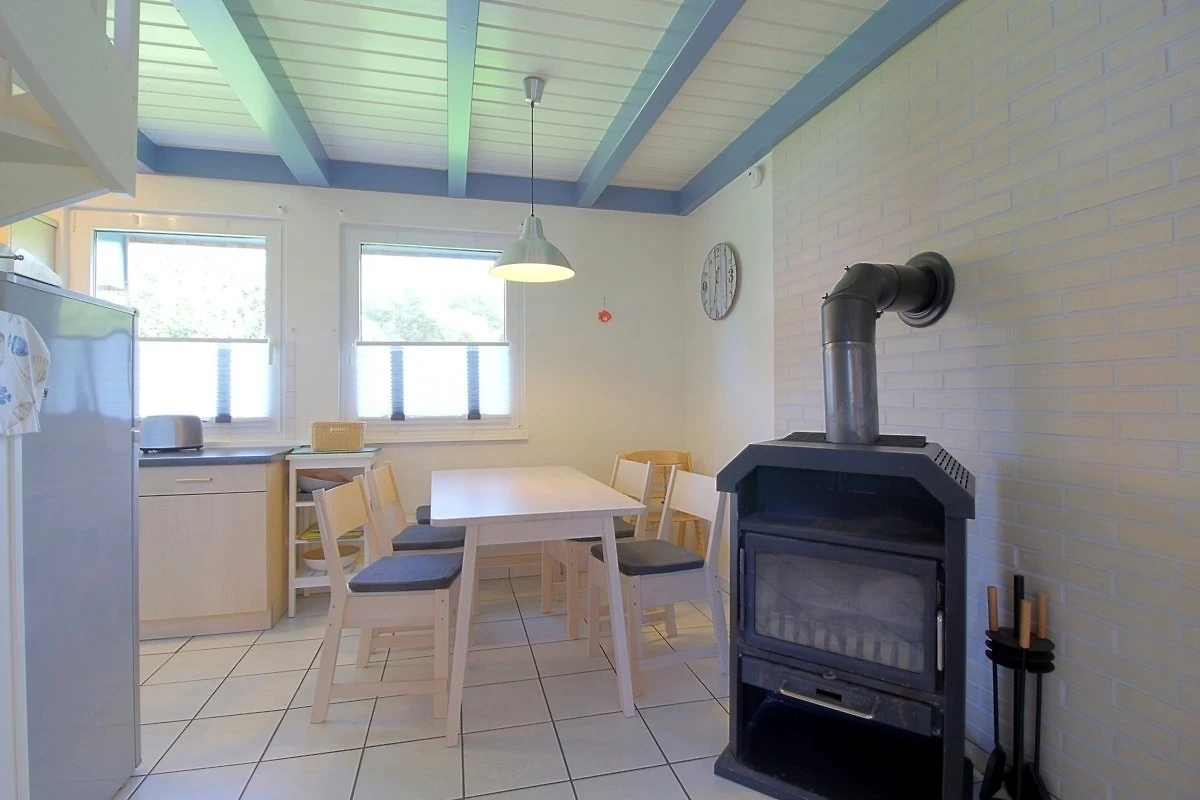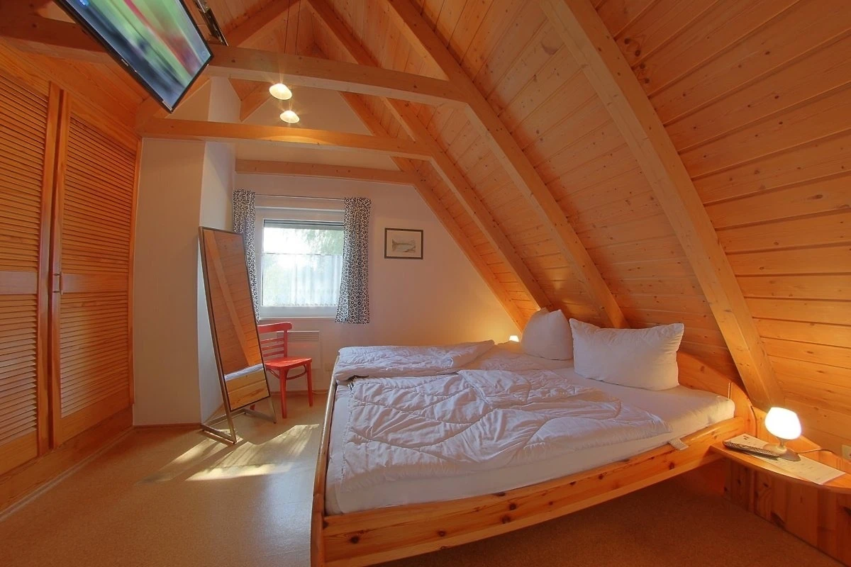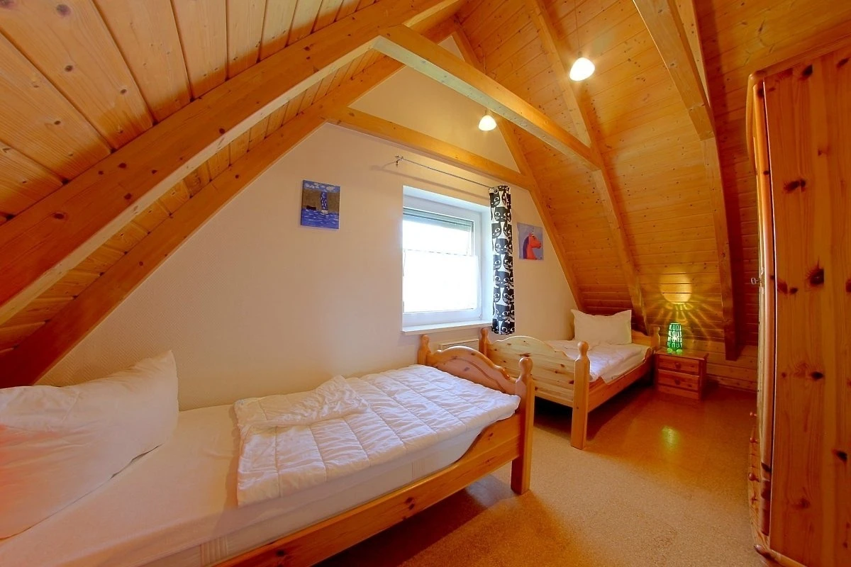 Das Ferienhaus besitzt 3 separate Schlafräume im Ober- und Erdgeschoss. Im Obergeschoss befindet sich ein Schlafzimmer mit Doppelbett und ein zweiter Schlafraum mit 2 Einzelbetten. Ein weiterer Schlafraum mit 2 Einzelbetten ist im Erdgeschoss vorhanden.