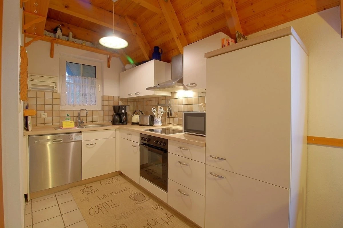 Eine voll ausgestattete Küche steht dem Smutje zur Verfügung. Sie beinhaltet eine Spülmaschine, einen Herd mit Backofen, einen Kühlschrank mit Gefrierfach, Toaster, Wasserkocher, Mikrowelle und Kaffeemaschine. Töpfe, Besteck und Geschirr sind auch vorhanden. Ein Kinderhochstuhl steht im Essbereich bereit.
