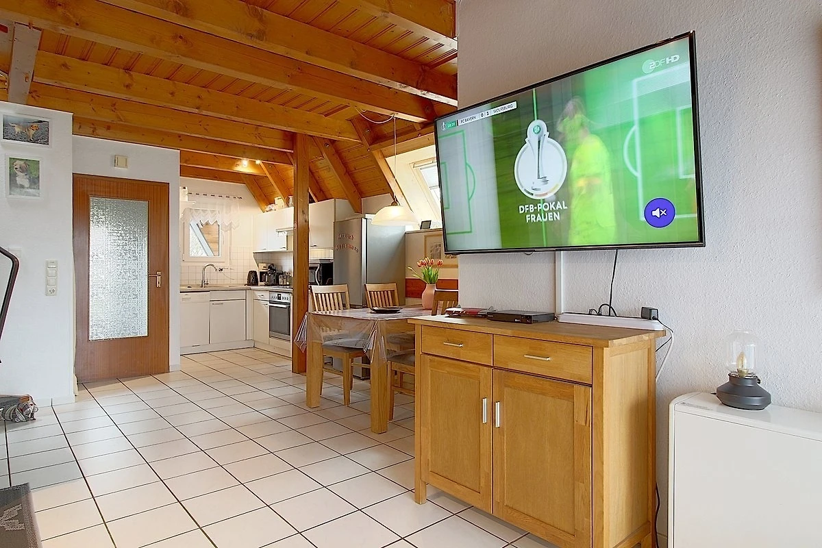 Im modern gestalteten, im Erdgeschoss komplett gefliesten Haus gibt es einen offenen Wohnbereich mit Flat-TV, Kaminofen für die kältere Jahreszeit, Essplatz und Küche mit komplett ausgestatteter moderner Einbauküche. Vom Wohnraum aus geht es direkt auf die Terrasse.