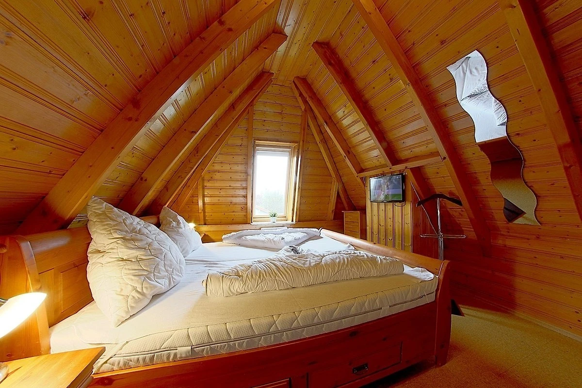 Im Obergeschoss befinden sich ein Schlafzimmer mit Doppelbett, Babybett und TV, sowie ein Schlafzimmer mit zwei Einzelbetten.