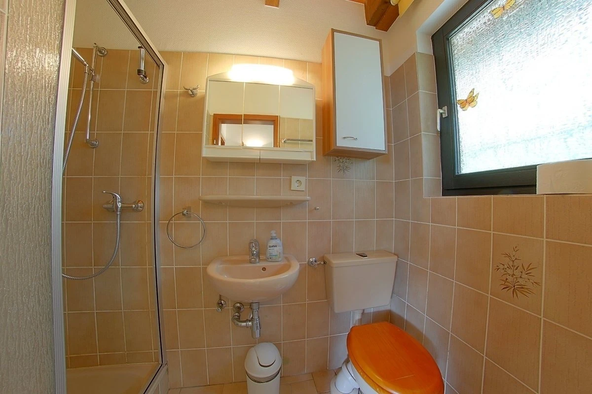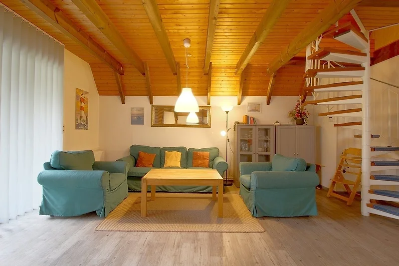 Im Erdgeschoss befindet sich das offene Wohnzimmer mit Küche und Essplatz sowie das geräumige und taghelle Duschbad.