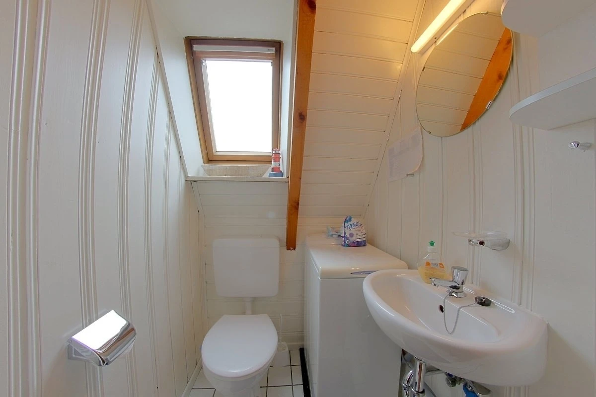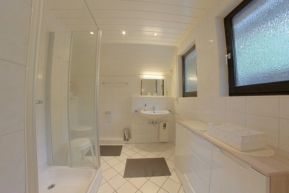 Das helle Duschbad mit Fenster und Rollo befindet sich ebenfalls im Erdgeschoss.
