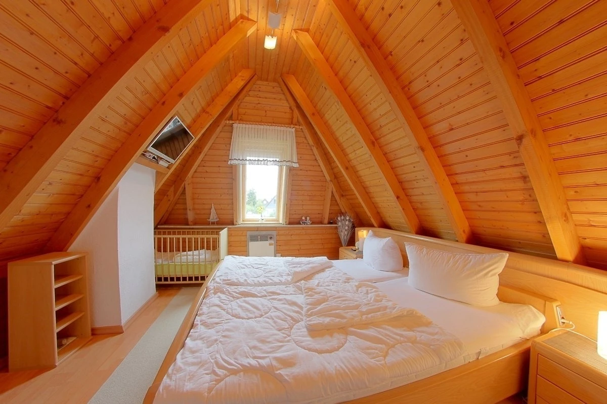Im Obergeschoss befinden sich 2 Schlafzimmer, eines mit Doppelbett, Babybett und TV und Verdunkelung incl. Fliegengitter.