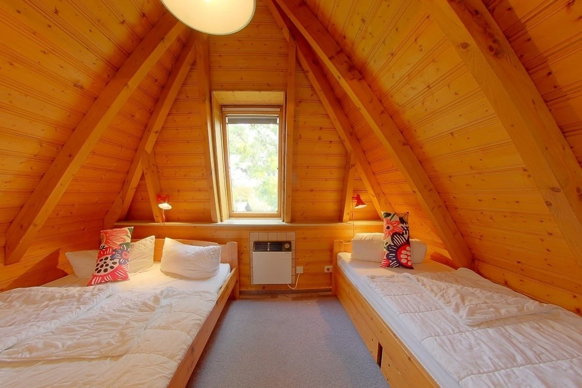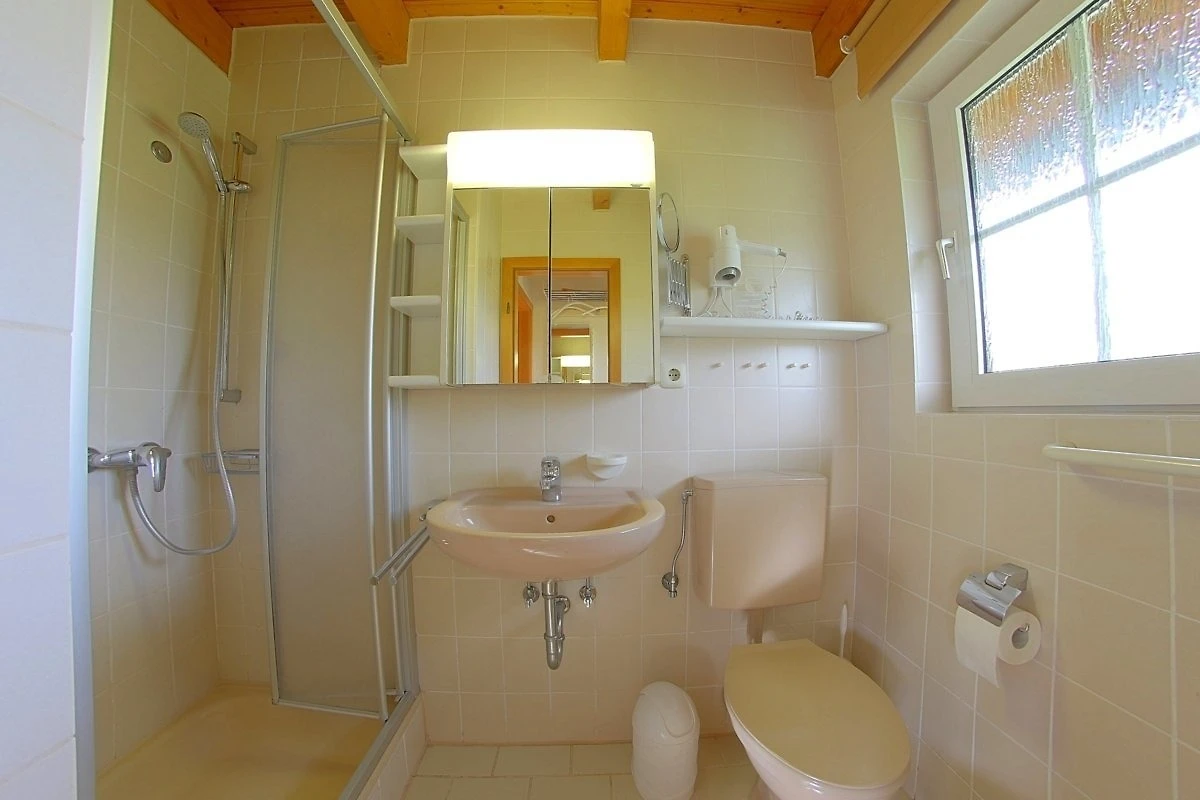 Im Obergeschoss steht Ihnen ein Schlafzimmer mit Doppelbett und TV, sowie ein Schlafzimmer mit französischem Bett ( 1,40 x 2 m) und ein Einzelbett zur Verfügung, sowie ein separates WC mit Waschbecken. Teppichboden in den Schlafräumen.