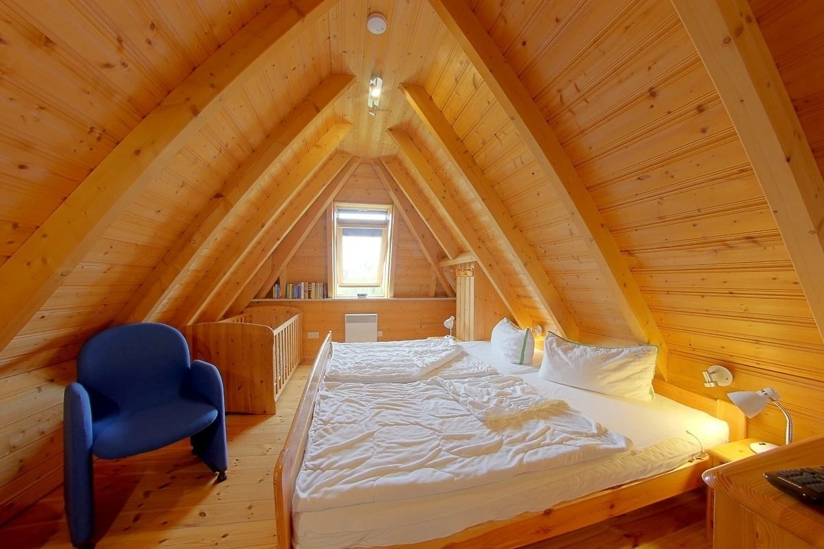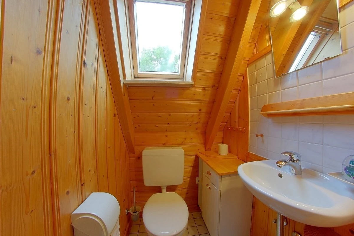 Im Obergeschoss sind die beiden Schlafzimmer mit 4 Betten sowie Kinderzustellbett. Ausserdem ein 2. WC mit Waschbecken.