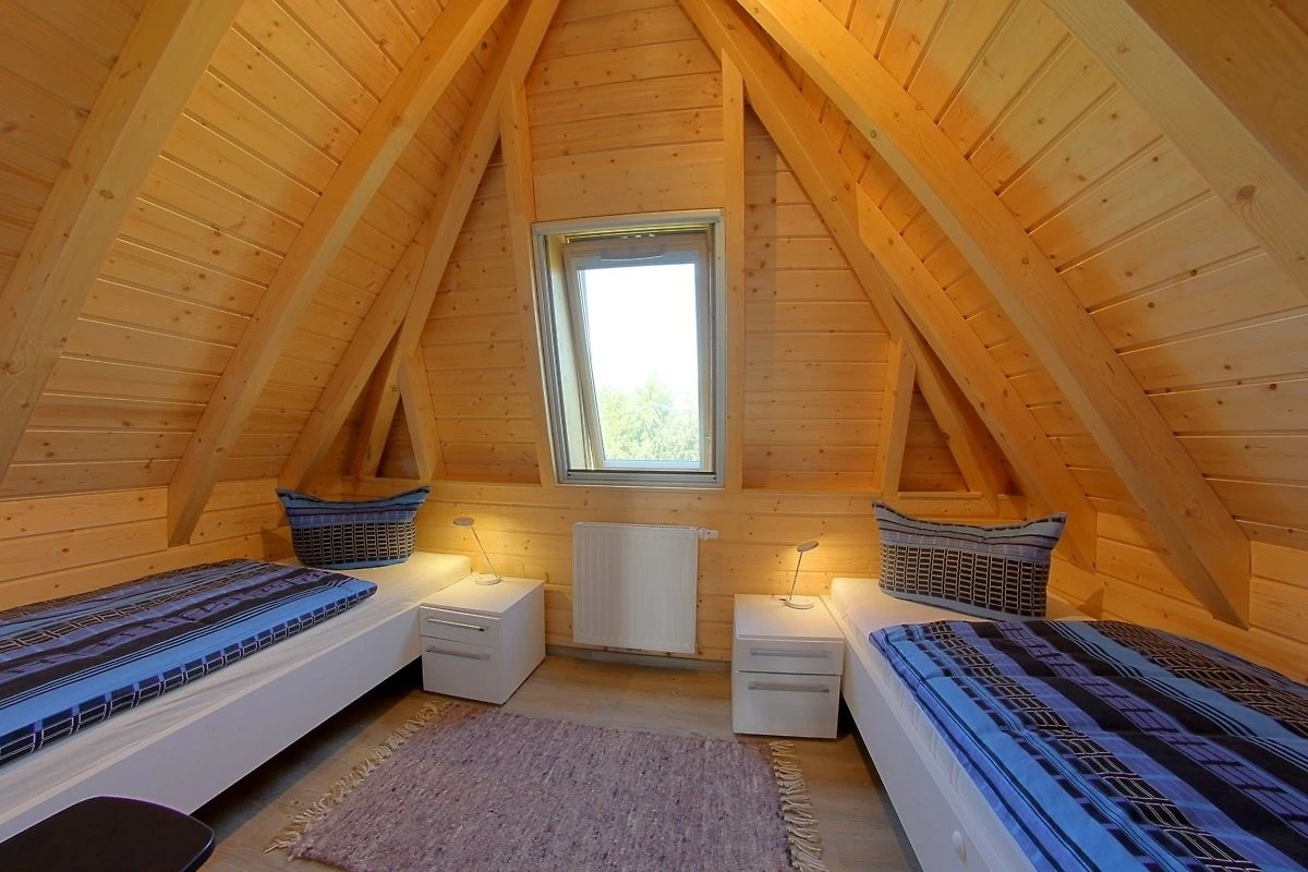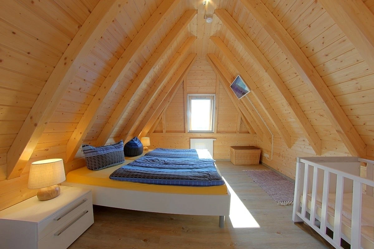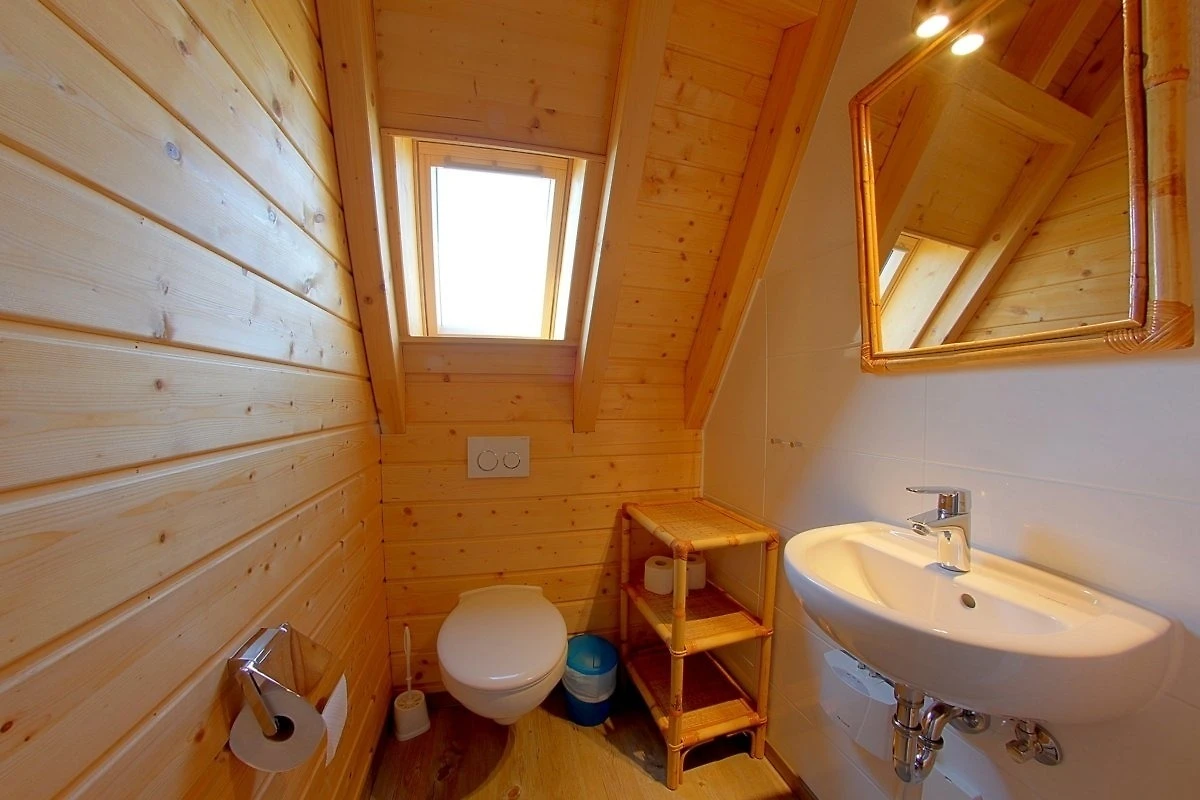 Im Obergeschoss befindet sich ein grosses Schlafzimmer mit Doppelbett, Babybett und TV, sowie ein weiteres Schlafzimmer mit 2 Einzelbetten und ein zusätzliches WC.