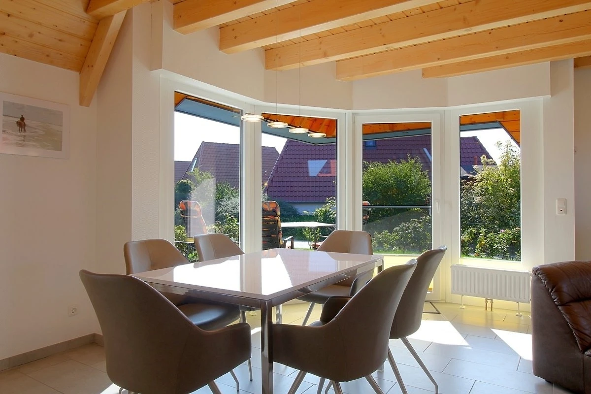 Die Küche ist komplett ausgestattet, hier kann der Smutje leckere Gerichte zaubern. Der Essplatz für bis zu 6 Personen bietet Platz für die ganze Familie. Ein modernes Duschbad mit Tageslicht, Dusche mit Flacheinstieg, Handtuchheizung und Waschmaschine befinden sich ebenfalls im Erdgeschoss.