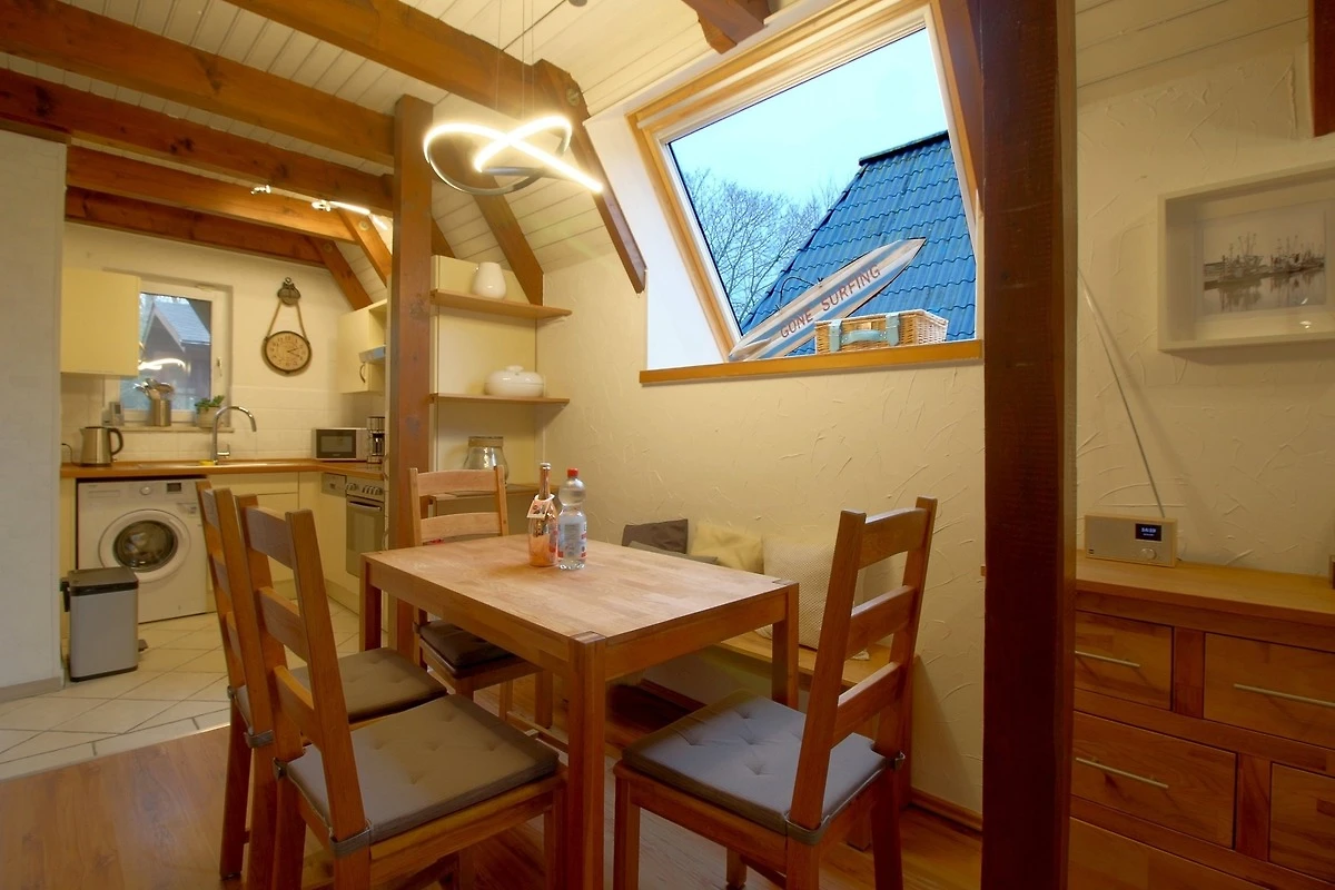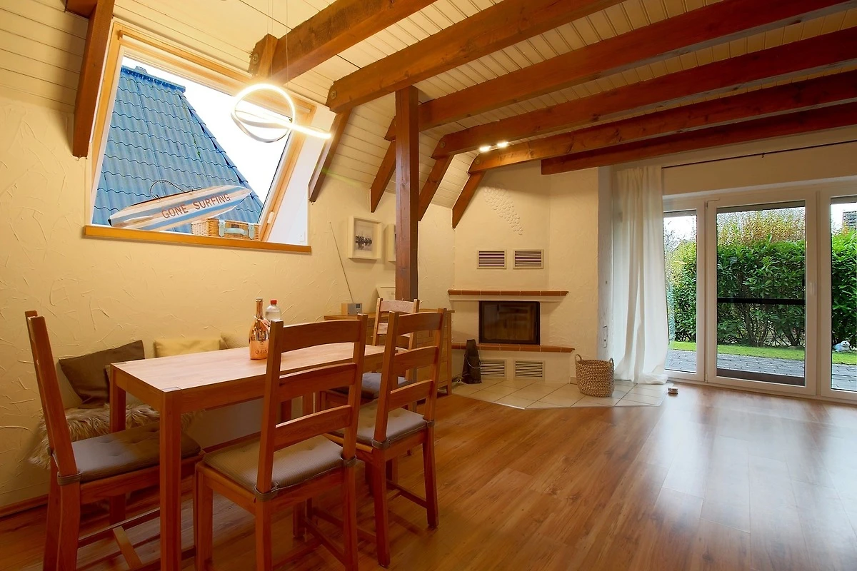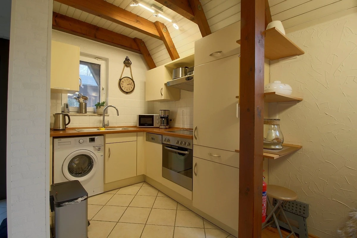 Das Nurdach-Haus befindet sich in einer Sackgasse. Im Erdgeschoss finden Sie einen offenen Wohn-/Ess- und Küchenbereich mit sehr gut ausgestatteter Einbauküche, die keine Wünsche offen lässt und den Smutje allein oder mit seinem Küchenteam zum Kochen einlädt. Die Waschmaschine ist praktischerweise in der Küchenzeile eingebaut.