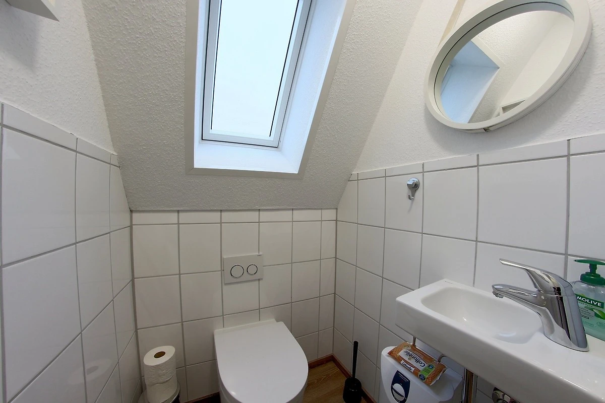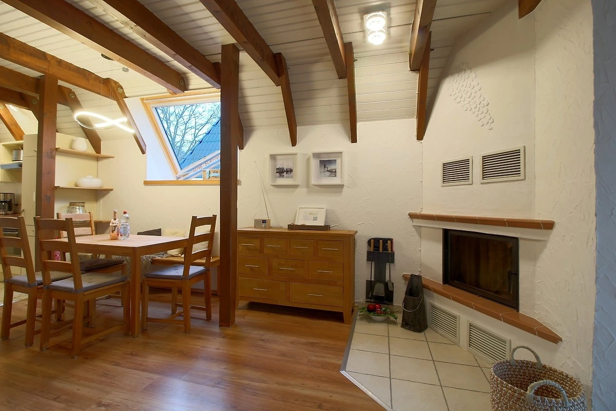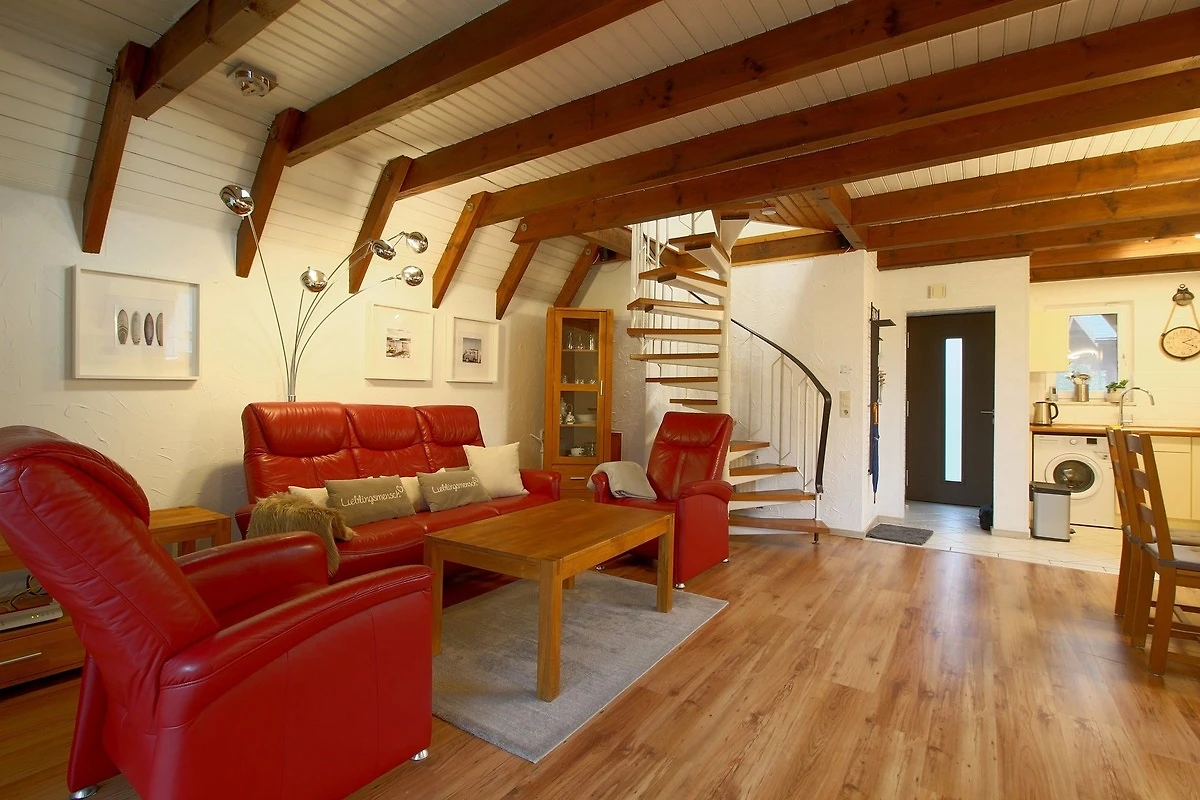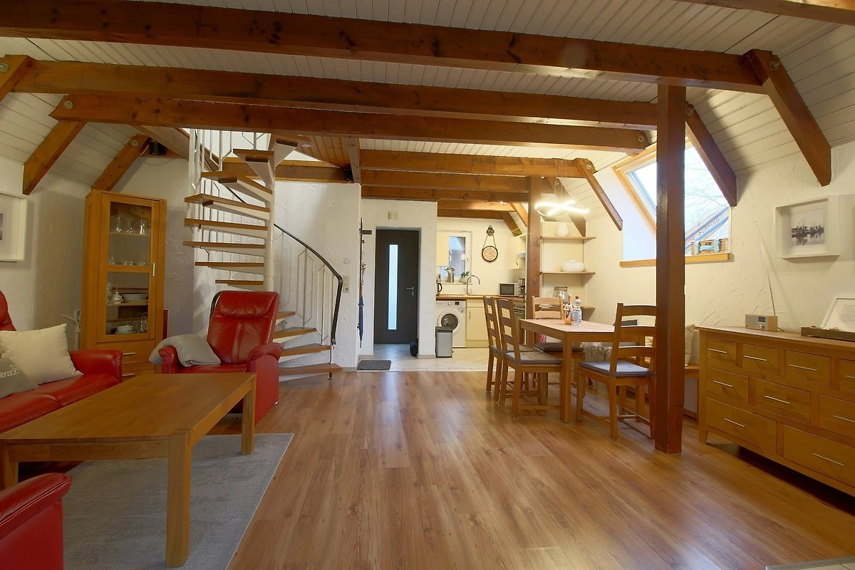 Das Nurdach-Haus befindet sich in einer Sackgasse. Im Erdgeschoss finden Sie einen offenen Wohn-/Ess- und Küchenbereich mit sehr gut ausgestatteter Einbauküche, die keine Wünsche offen lässt und den Smutje allein oder mit seinem Küchenteam zum Kochen einlädt. Die Waschmaschine ist praktischerweise in der Küchenzeile eingebaut.