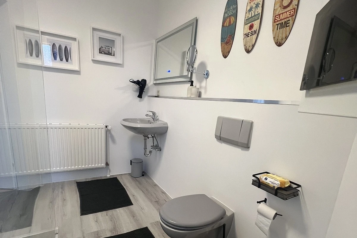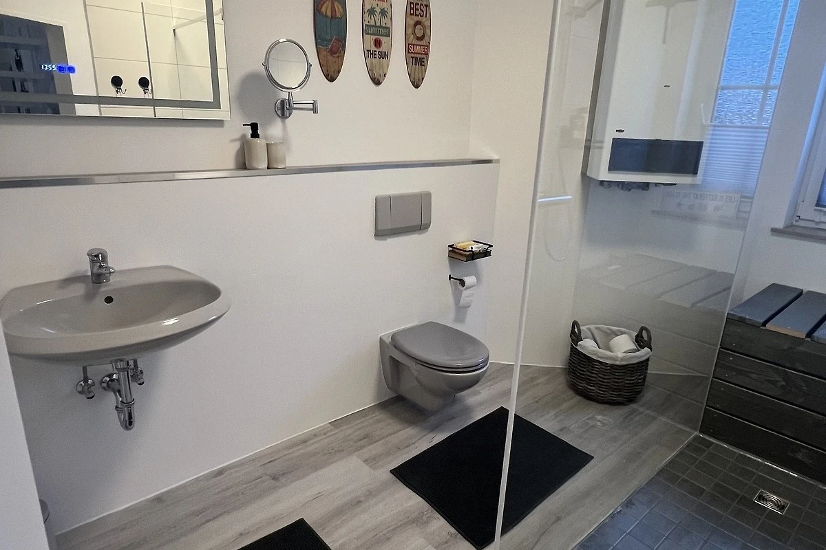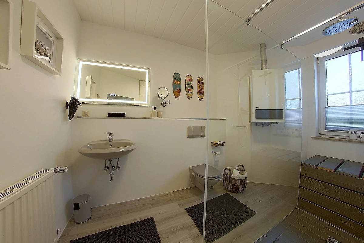 Das Duschbad mit begehbarer sehr grosser Dusche und WC liegt ebenfalls im Erdgeschoss, sowie der Abstellraum mit Waschmaschine. Eine Wellness-Oase im kuscheligen Nordseebad Dorum-Neufeld.