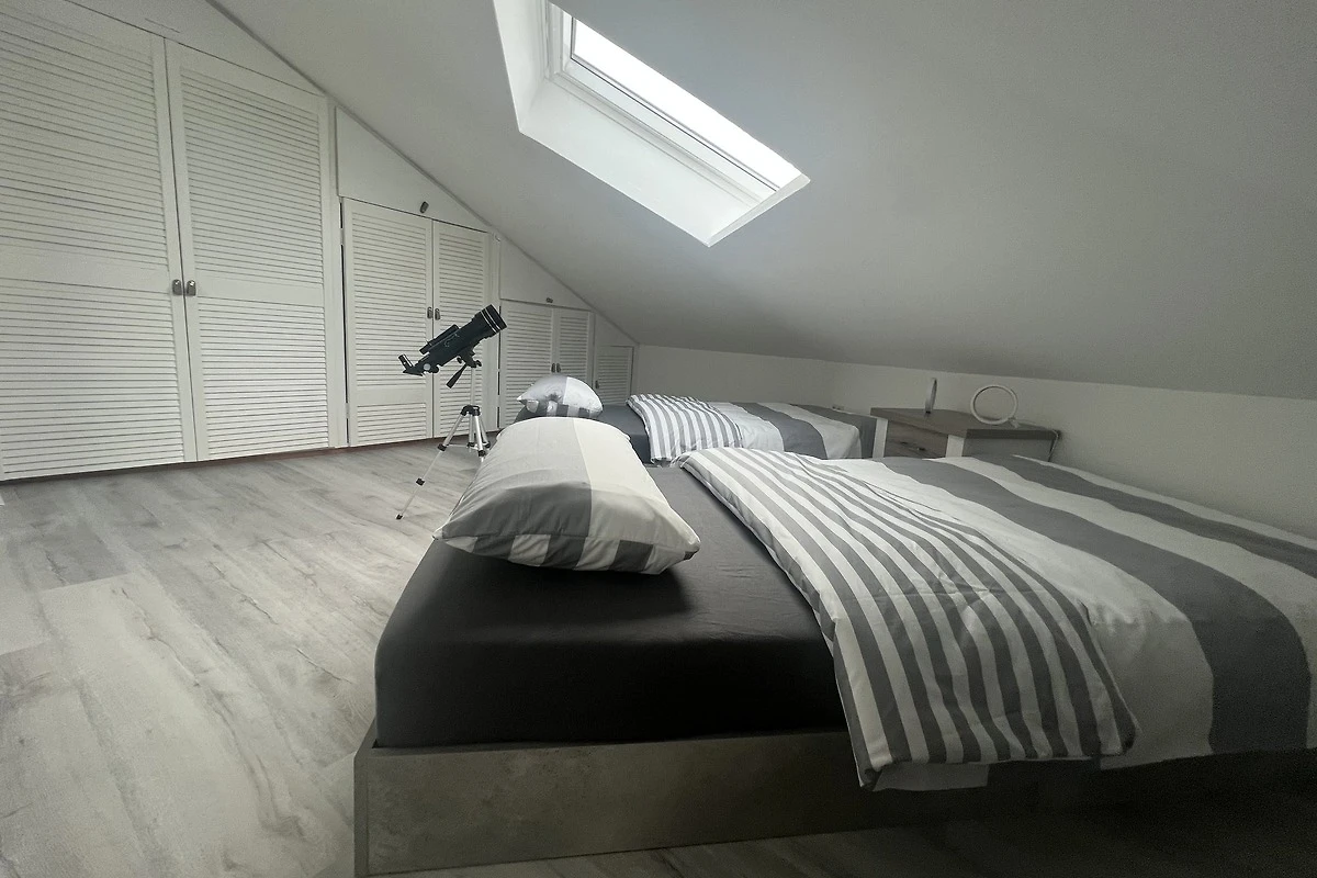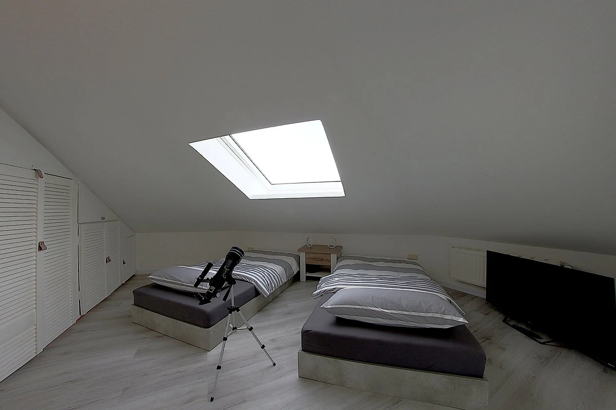 Im Obergeschoss befindet sich ein Schlafzimmer mit 2 Einzelbetten, die auf Wunsch zu einem Doppelbett verbunden werden können. Ein Flachbildfernseher steht zur Verfügung (Streamingdienste können mit eigenem Account genutzt werden). Mit dem Teleskop ist für Gross und Klein ist der Blick in die Sterne sicher.