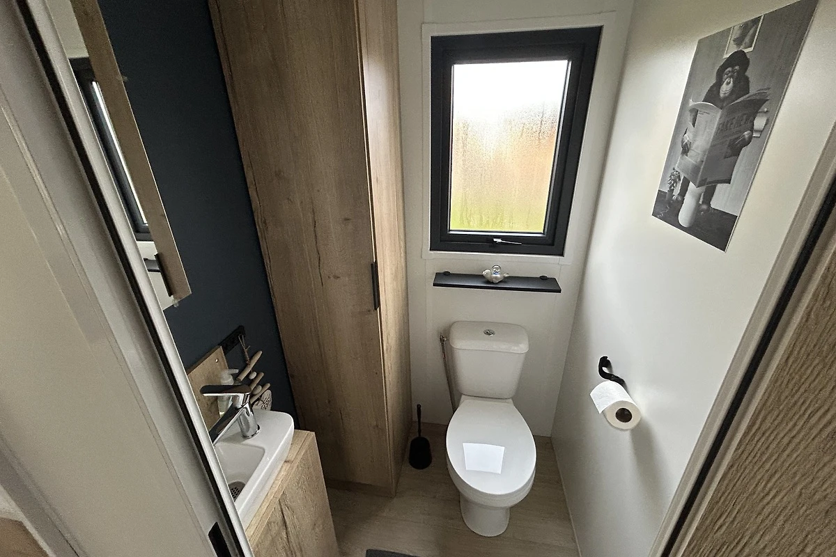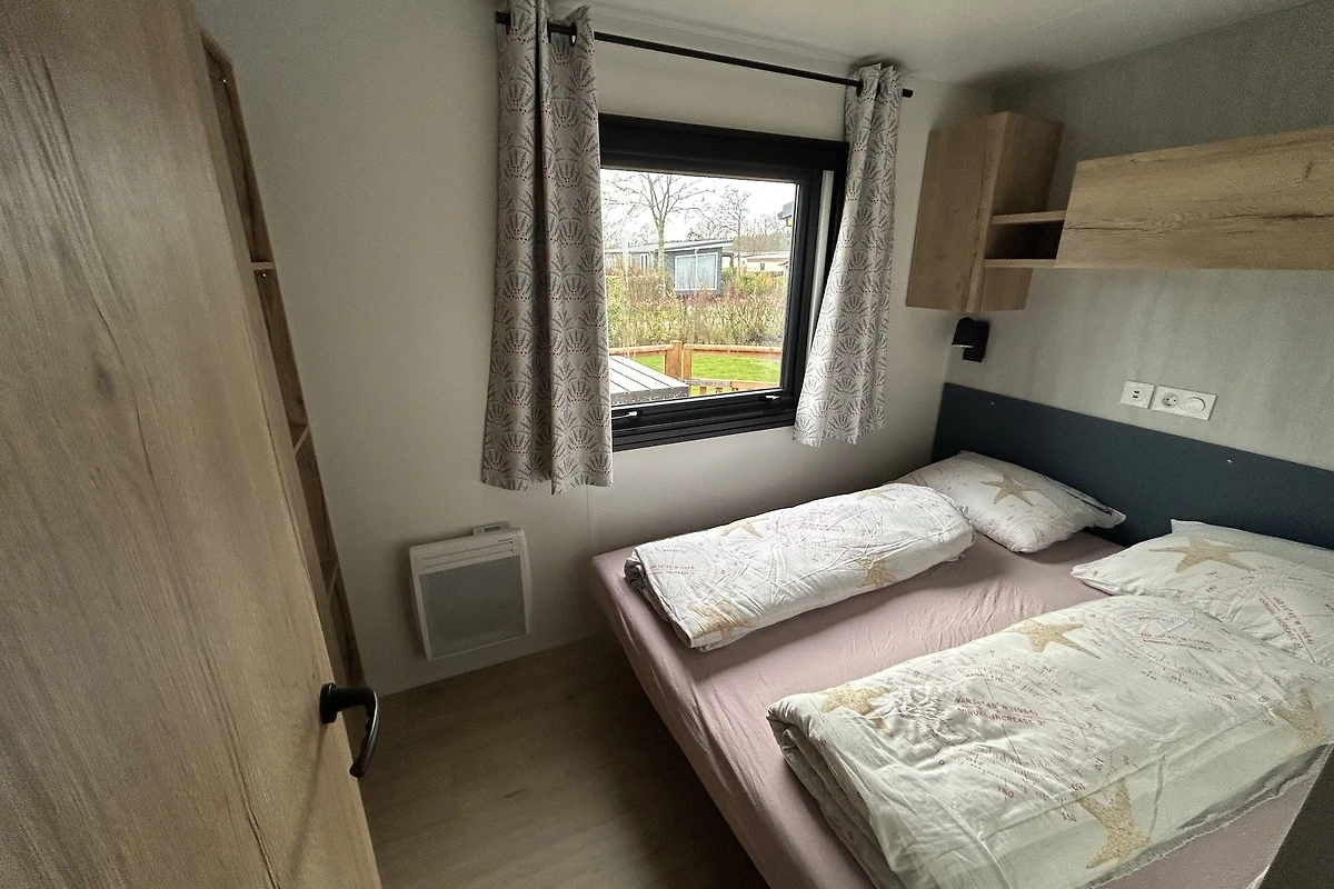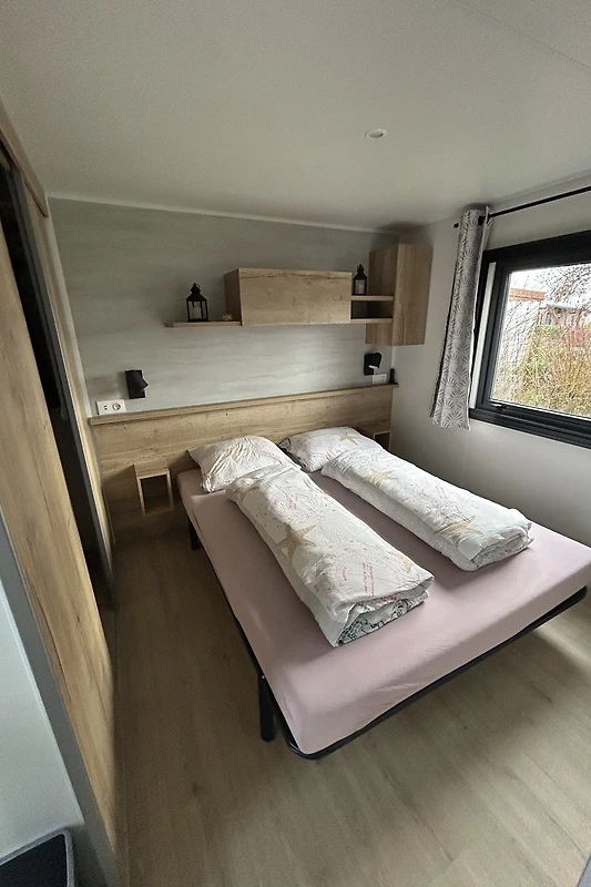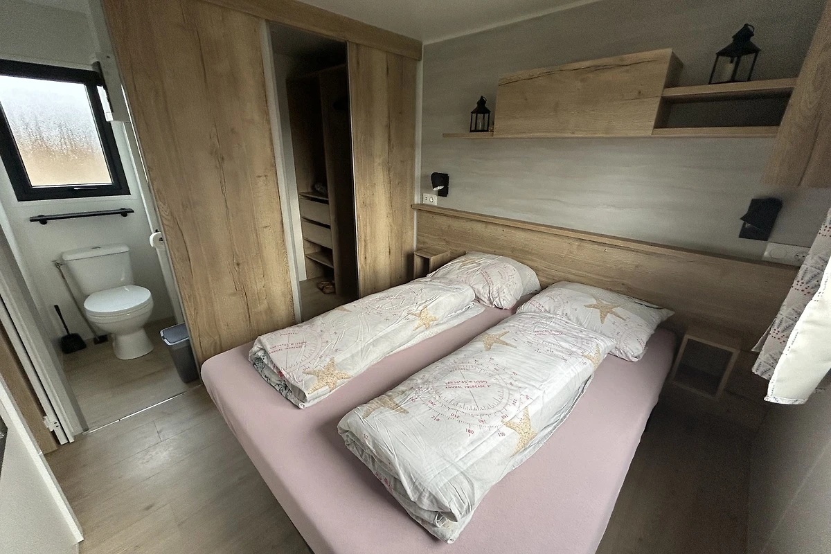 Das Chalet bietet auf 40 m² Platz für bis zu vier Gäste und verfügt über zwei Schlafzimmer sowie zwei Toiletten.