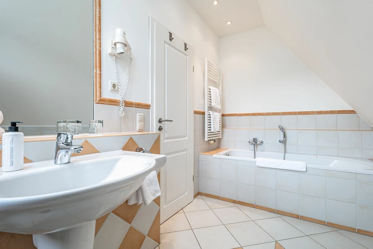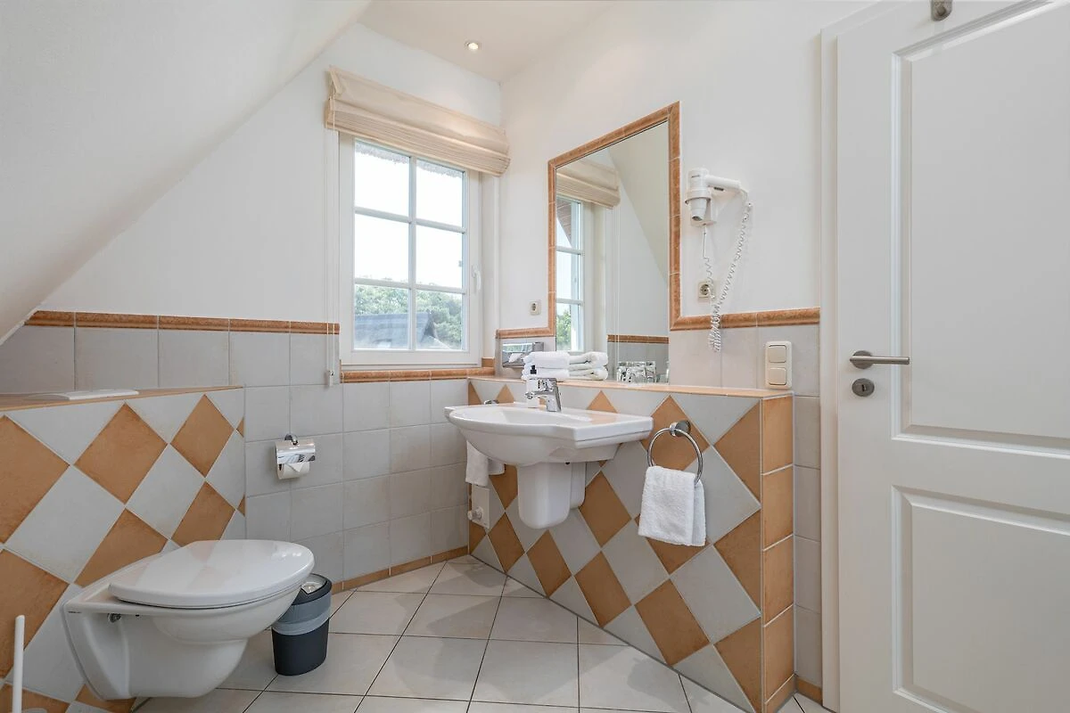 Im Obergeschoss erwartet Sie das zweite Schlafzimmer, welches ebenfalls mit einem Doppelbett und einem Kleiderschrank ausgestattet ist. Das Obergeschoss-Bad verfügt zudem über eine Badewanne.