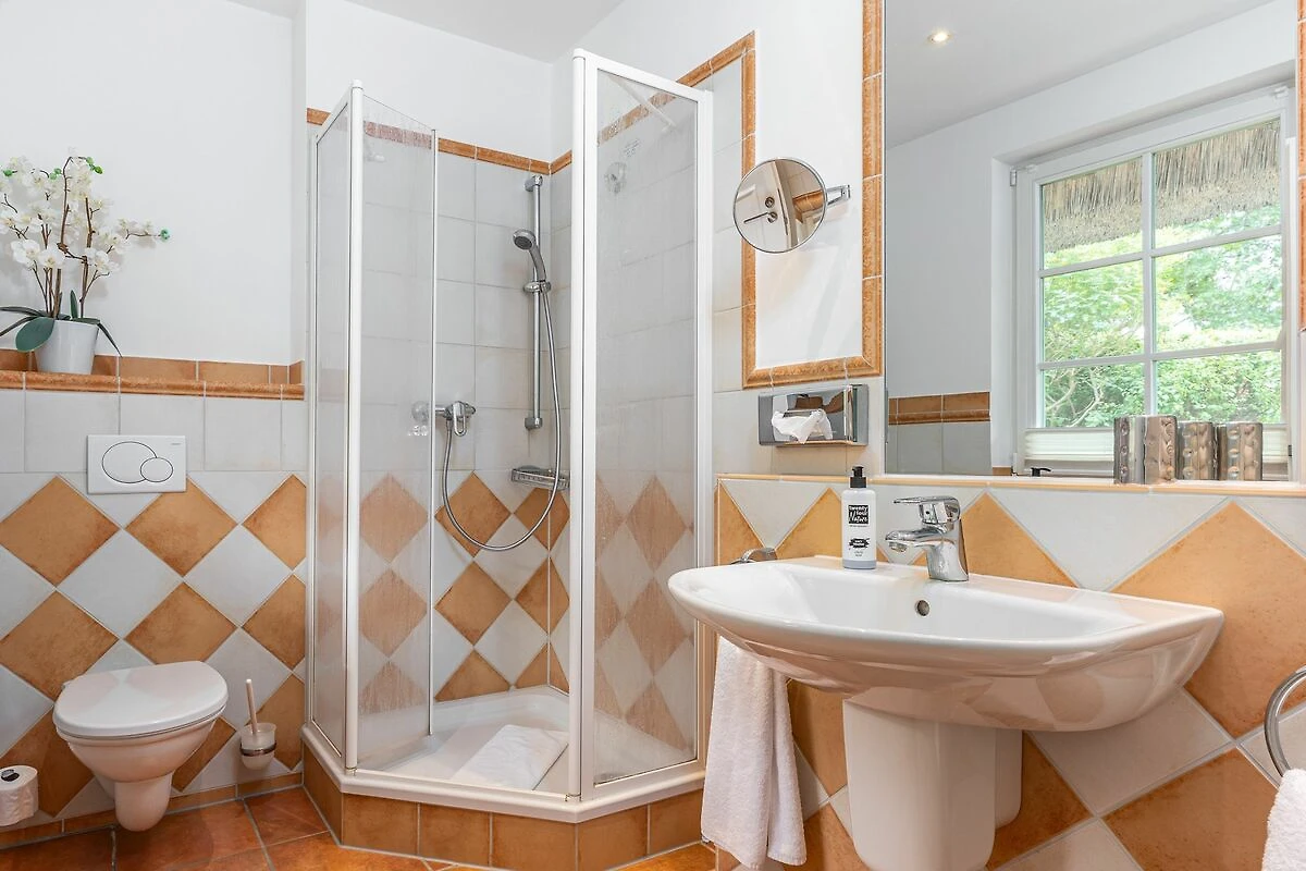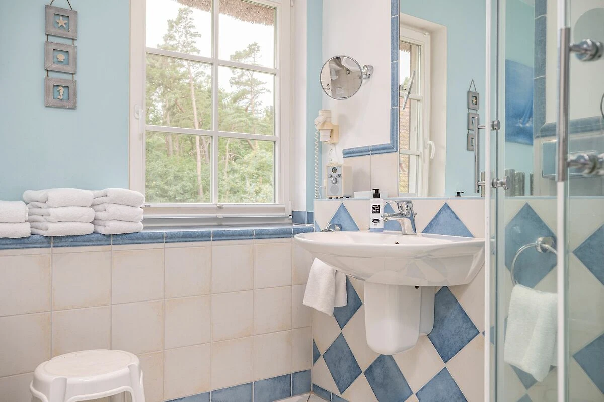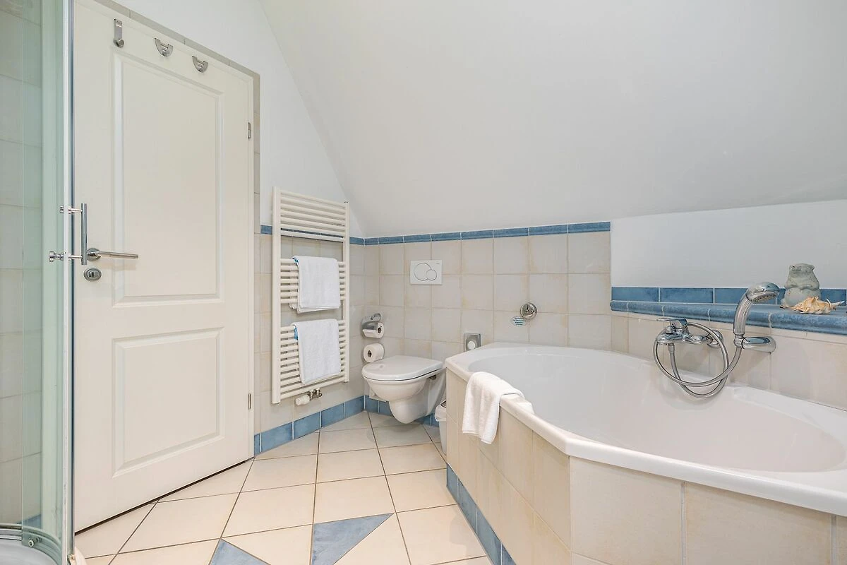 Im ersten Obergeschoss finden Sie drei Schlafzimmer, die alle genügend Platz und Stauraum bieten, um Ihr Urlaubsgebäck zu verstauen. Zwei der Schlafzimmer sind mit Doppelbetten ausgestattet und das dritte Schlafzimmer dieser Etage verfügt über zwei Einzelbetten. Im Badezimmer dieser Etage befindet sich ebenfalls das geräumigere Badezimmer, das mit einer Dusche und einer Badewanne aufwartet.