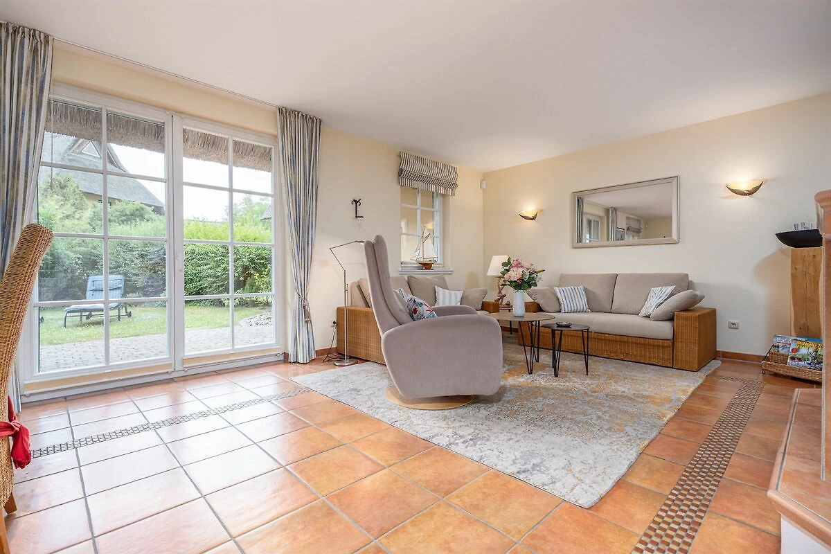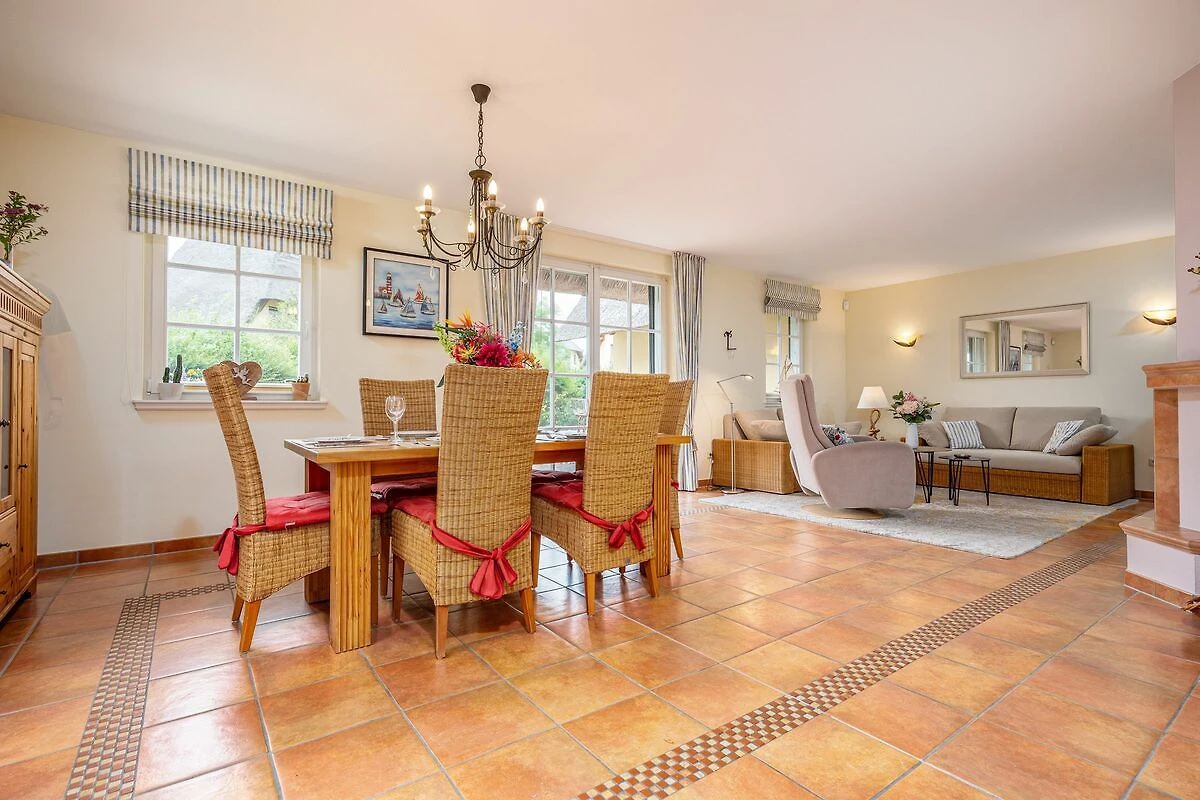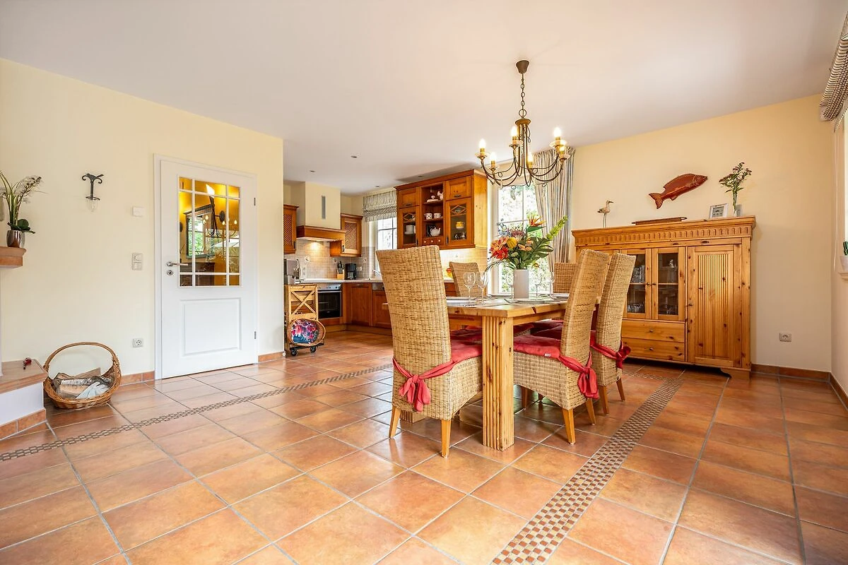 Das Haus ist vollständig umfriedet und bietet Ihnen neben einer großen Spiel- und Liegewiese viel Platz, um bei wärmeren Temperaturen auch im Freien Ihre Mahlzeiten zu genießen. Diese können Sie im Erdgeschoss in der voll ausgestatteten Küche zubereiten. Der offene Wohn- und Essbereich besticht durch seine großen Fenster mit viel Licht und Wärme. In den kälteren Jahreszeiten werden Sie vor dem Kamin ebenfalls heimelige Stunden verbringen.