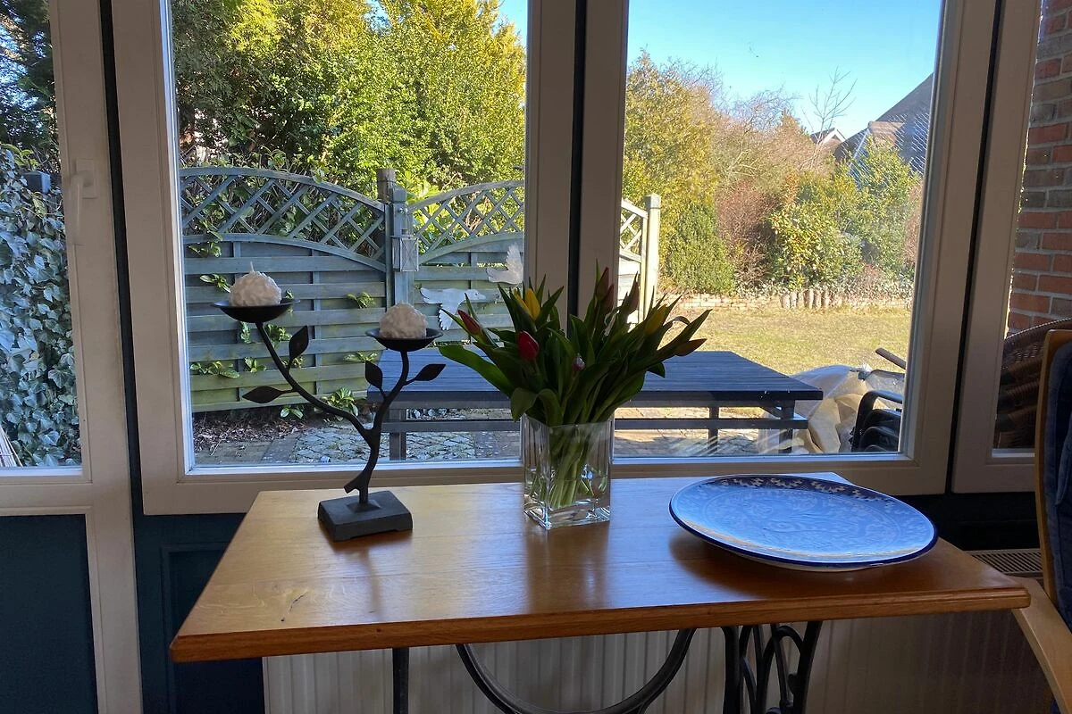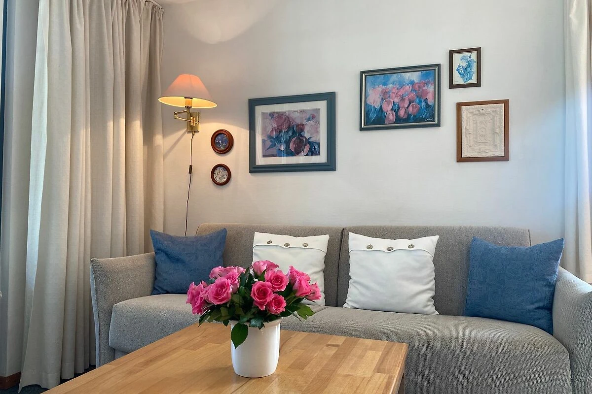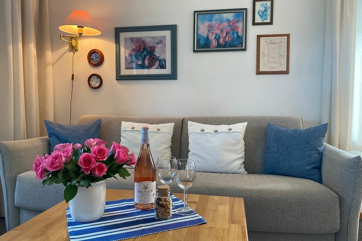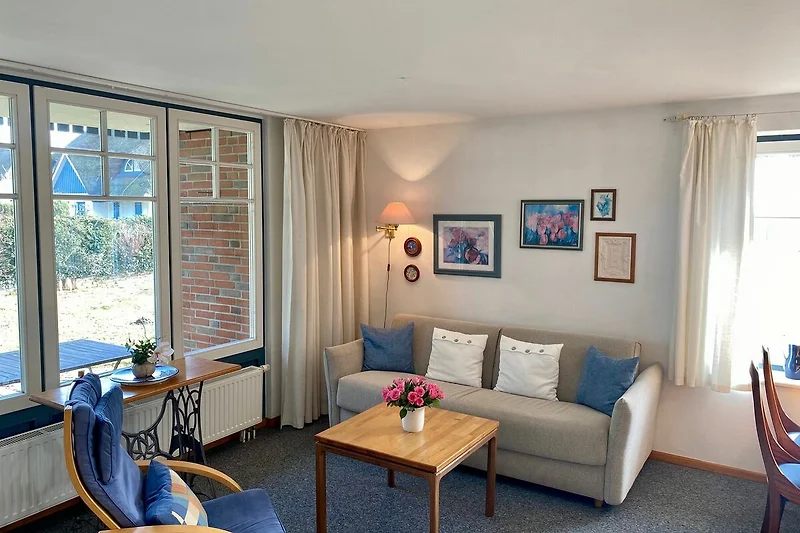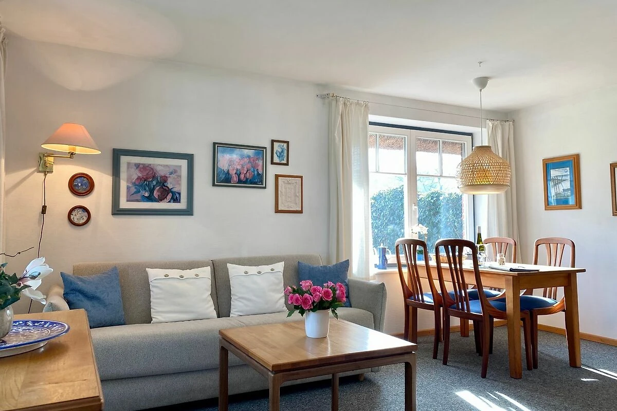 Diese einladende Erdgeschoss-Ferienwohnung für zwei bis drei Personen befindet sich in einem reetgedeckten Haus und verbindet maritimes Flair mit komfortabler Ausstattung. Das helle Schlafzimmer mit gemütlichem Doppelbett sorgt für erholsame Nächte, während im Wohnbereich ein zusätzliches Schlafsofa bereitsteht – ideal für entspannte Lesestunden oder einen spontanen Besuch.