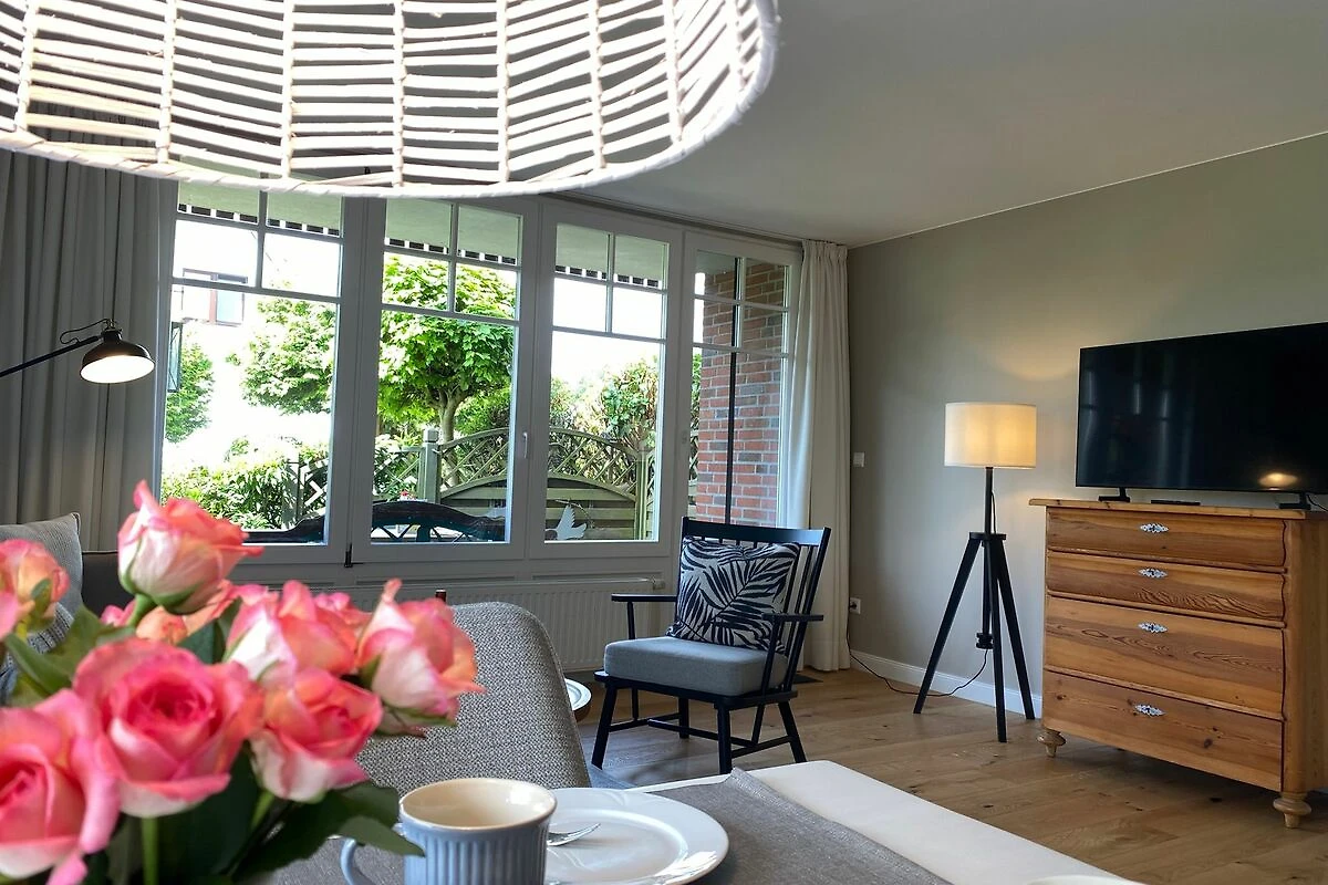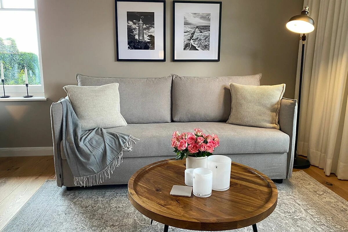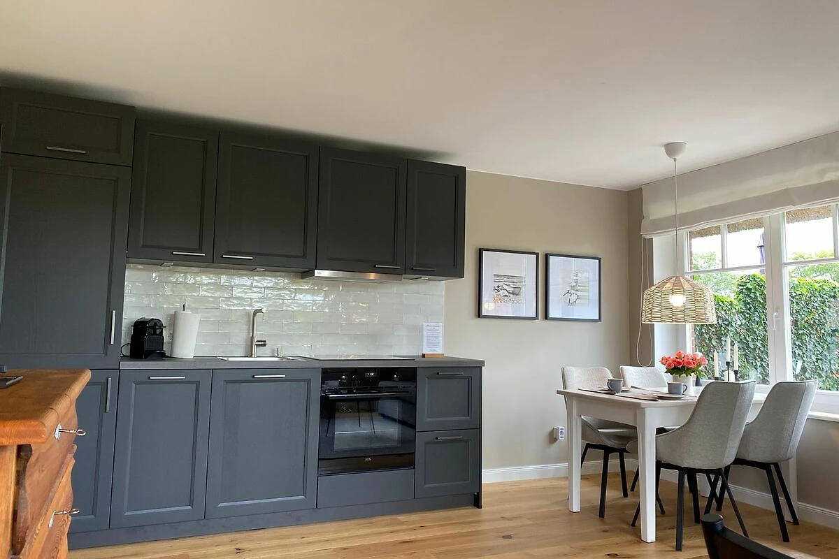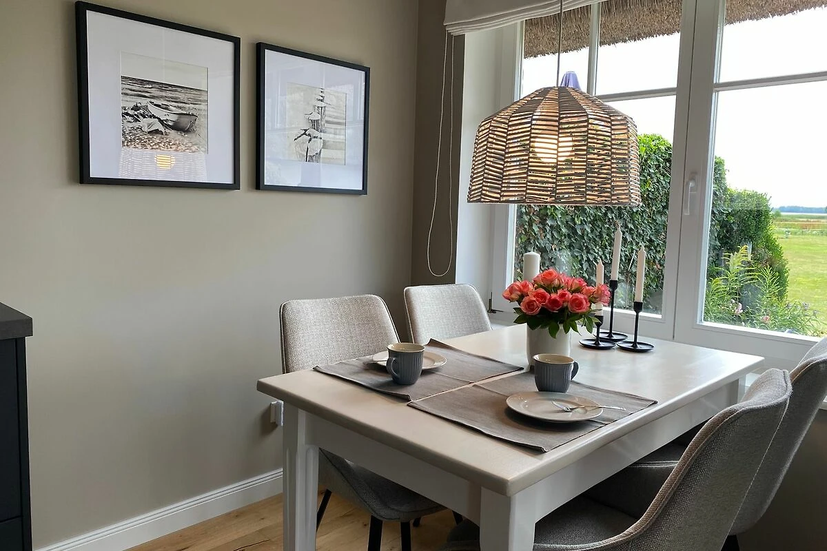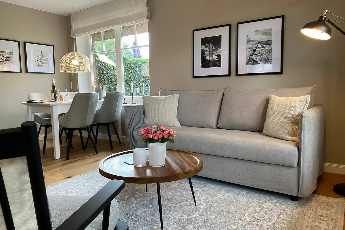 Diese frisch sanierte Erdgeschosswohnung bietet auf 44 m² ein elegantes Zuhause auf Zeit für zwei Personen. Im reetgedeckten Haus gelegen und nur wenige Gehminuten vom ruhigen Bodden entfernt, verbindet sie zeitgemäßen Wohnkomfort mit maritimem Charme.