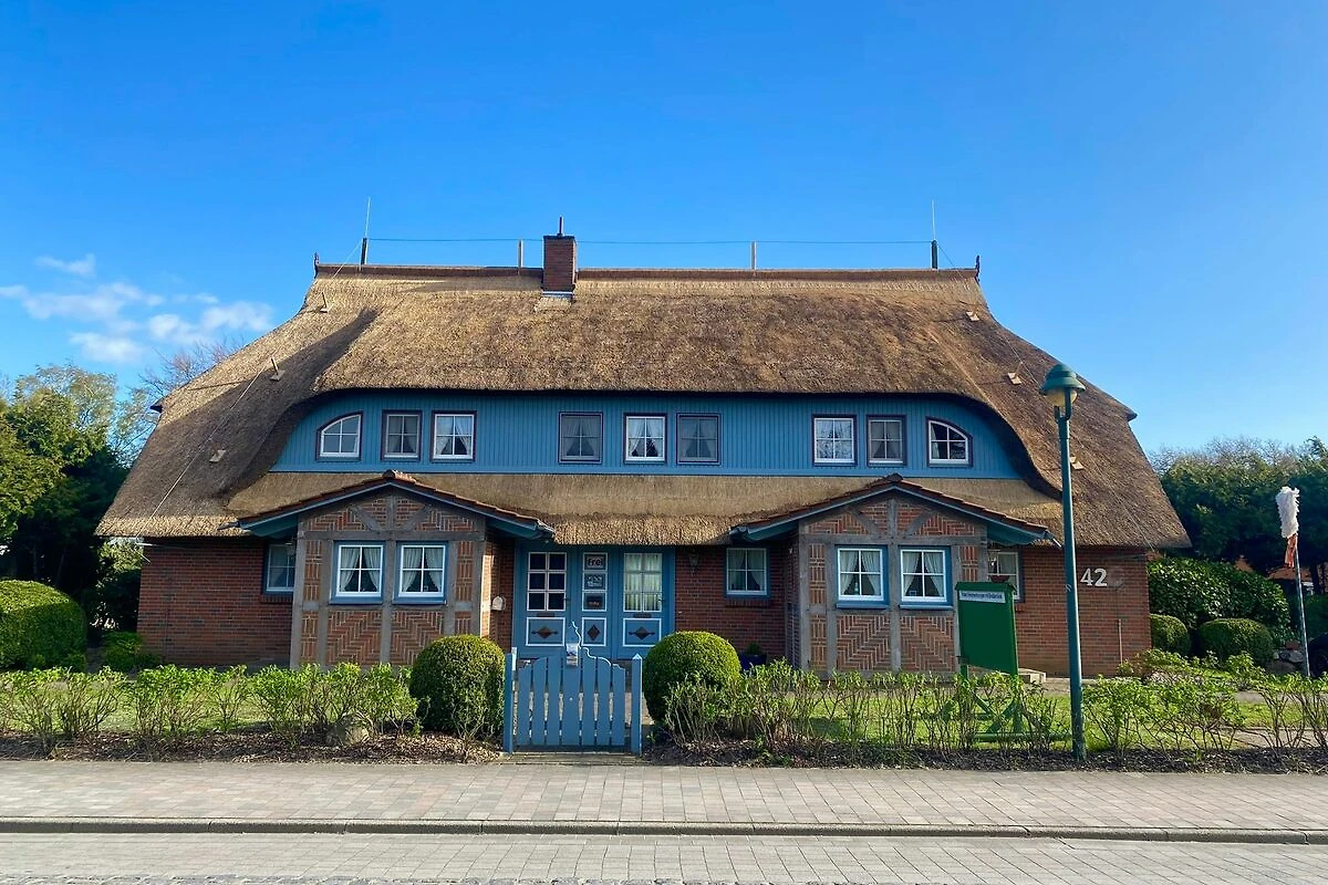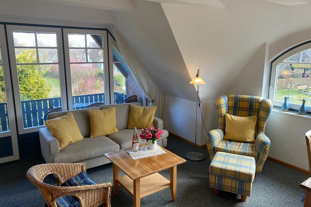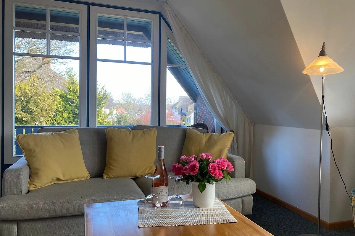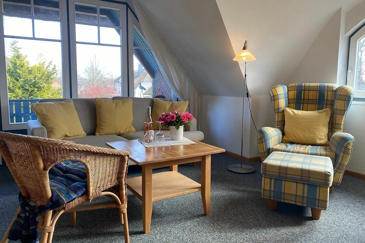 In diesem charmanten, reetgedeckten Haus erwartet Sie eine großzügige Maisonette-Wohnung, die auf zwei Ebenen ein wunderbar luftiges Wohngefühl bietet. Das Herzstück bildet der helle Wohnbereich: Eine weitläufige Fensterfront lässt das Tageslicht hereinströmen und eröffnet eine sanfte Aussicht auf die ruhige Natur rund um den Bodden. Egal ob beim Frühstück, beim Lesen oder beim entspannten Zusammensitzen – hier fühlt sich jeder Moment ein wenig nach Urlaub an.