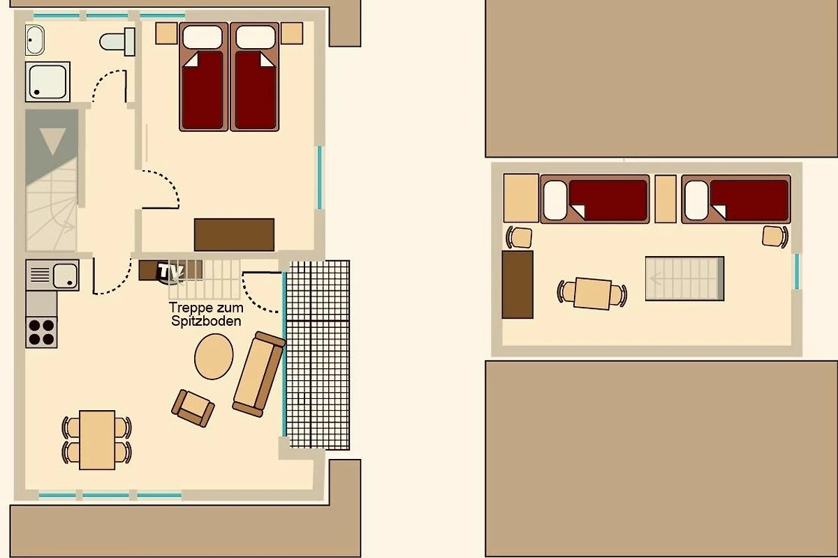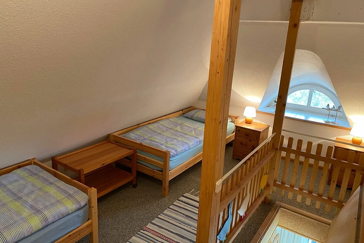 Die Wohnung verfügt über zwei gemütliche Schlafzimmer: ein behagliches Doppelbettzimmer auf der unteren Ebene und ein zusätzliches Schlafrefugium im Spitzboden mit zwei Einzelbetten – ideal für Kinder, Freunde oder Mitreisende, die den Charme der Dachschrägen lieben (beachten Sie bitte, dass der Zugang zum Spitzboden nur über eine relativ steile Treppe möglich ist).