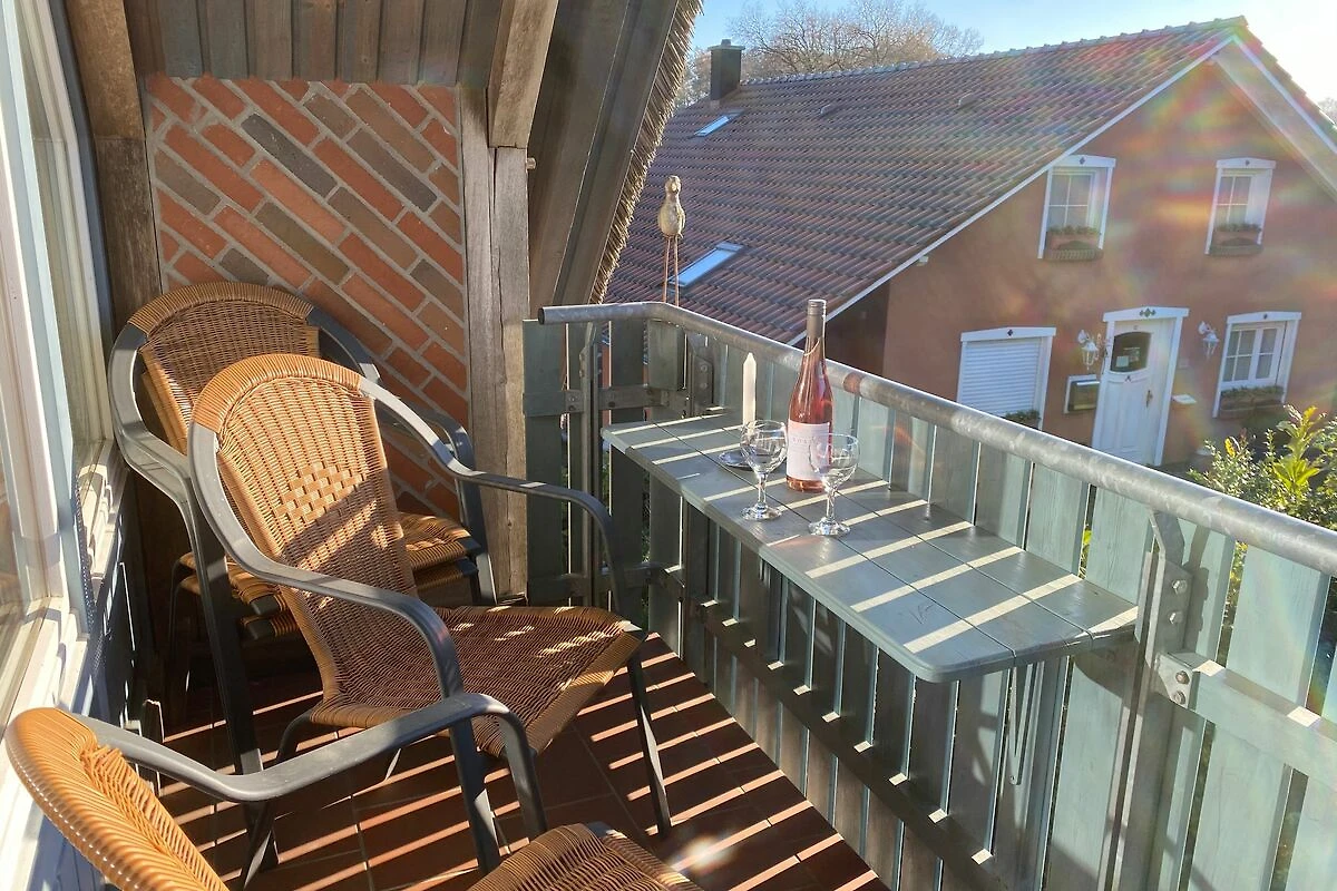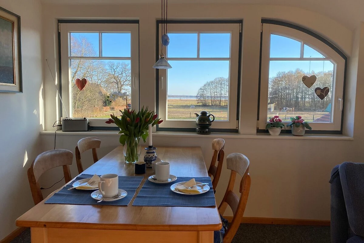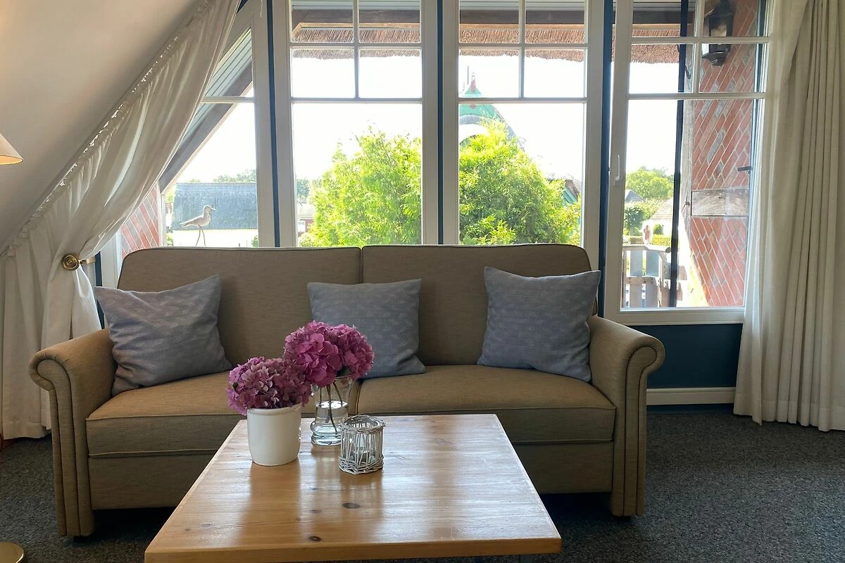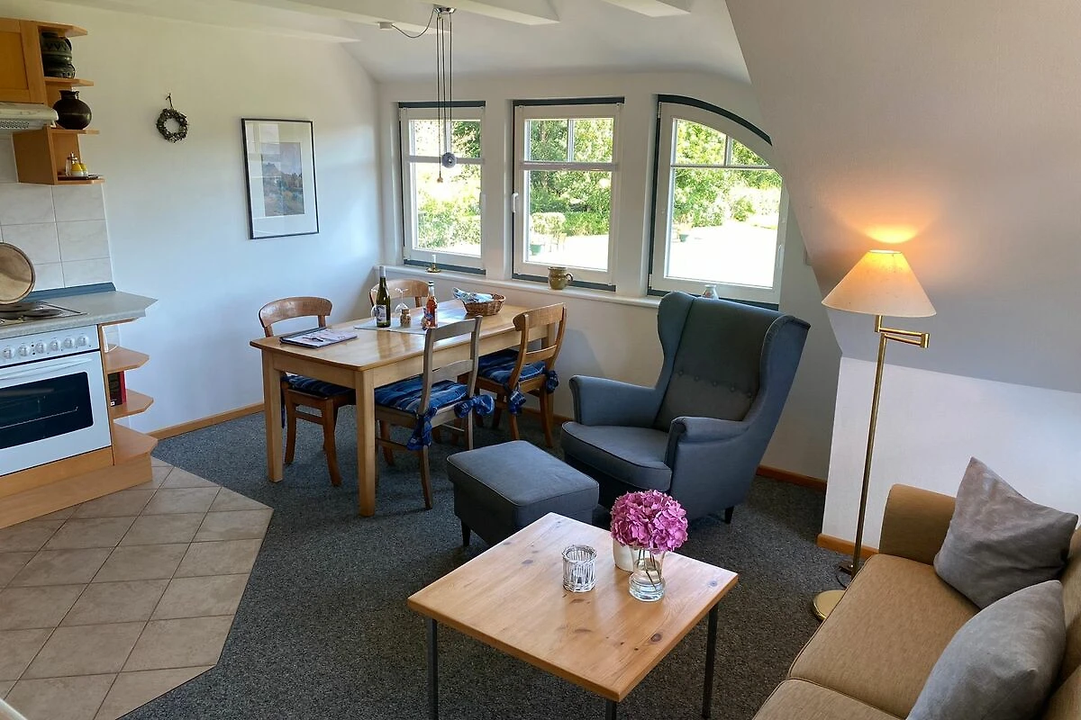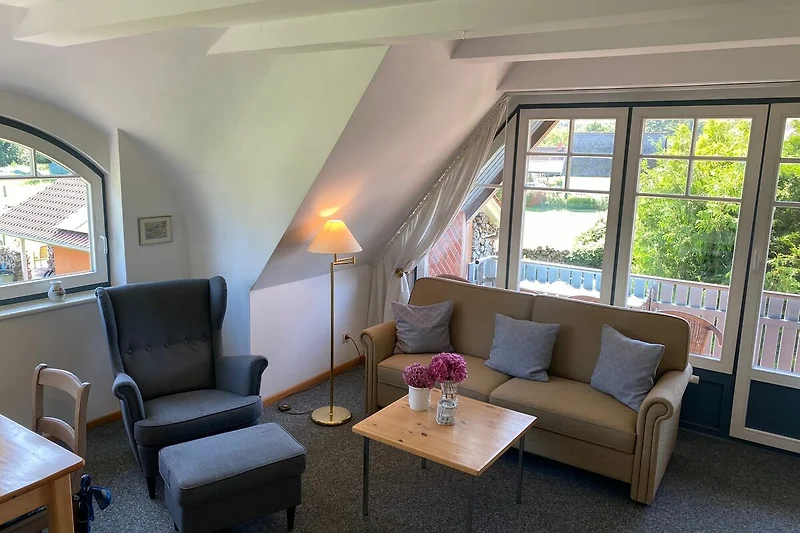 In diesem charmanten, reetgedeckten Haus erwartet Sie eine großzügige Maisonette-Wohnung, die auf zwei Ebenen ein wunderbar luftiges Wohngefühl bietet. Das Herzstück bildet der helle Wohnbereich: Eine weitläufige Fensterfront lässt das Tageslicht hereinströmen und eröffnet eine sanfte Aussicht auf die ruhige Natur rund um den Bodden. Egal ob beim Frühstück, beim Lesen oder beim entspannten Zusammensitzen – hier fühlt sich jeder Moment ein wenig nach Urlaub an.