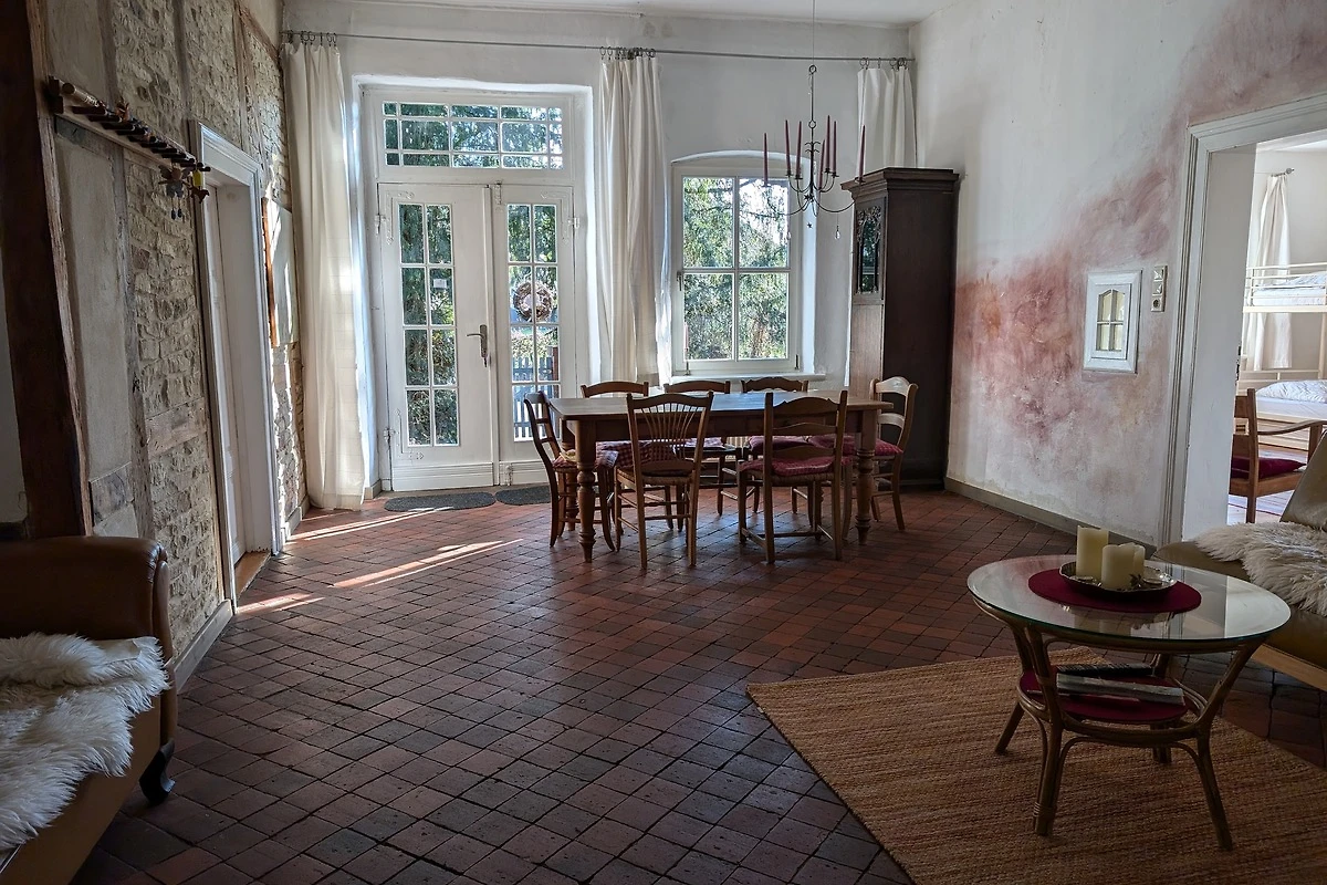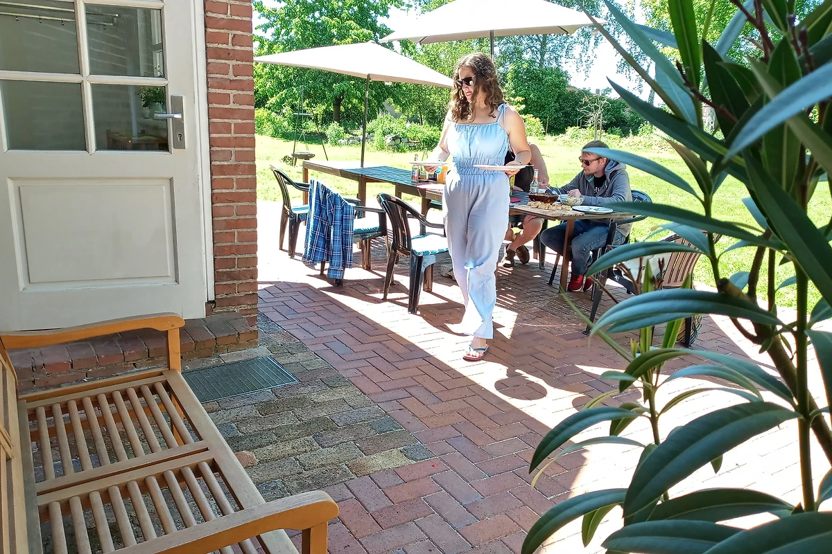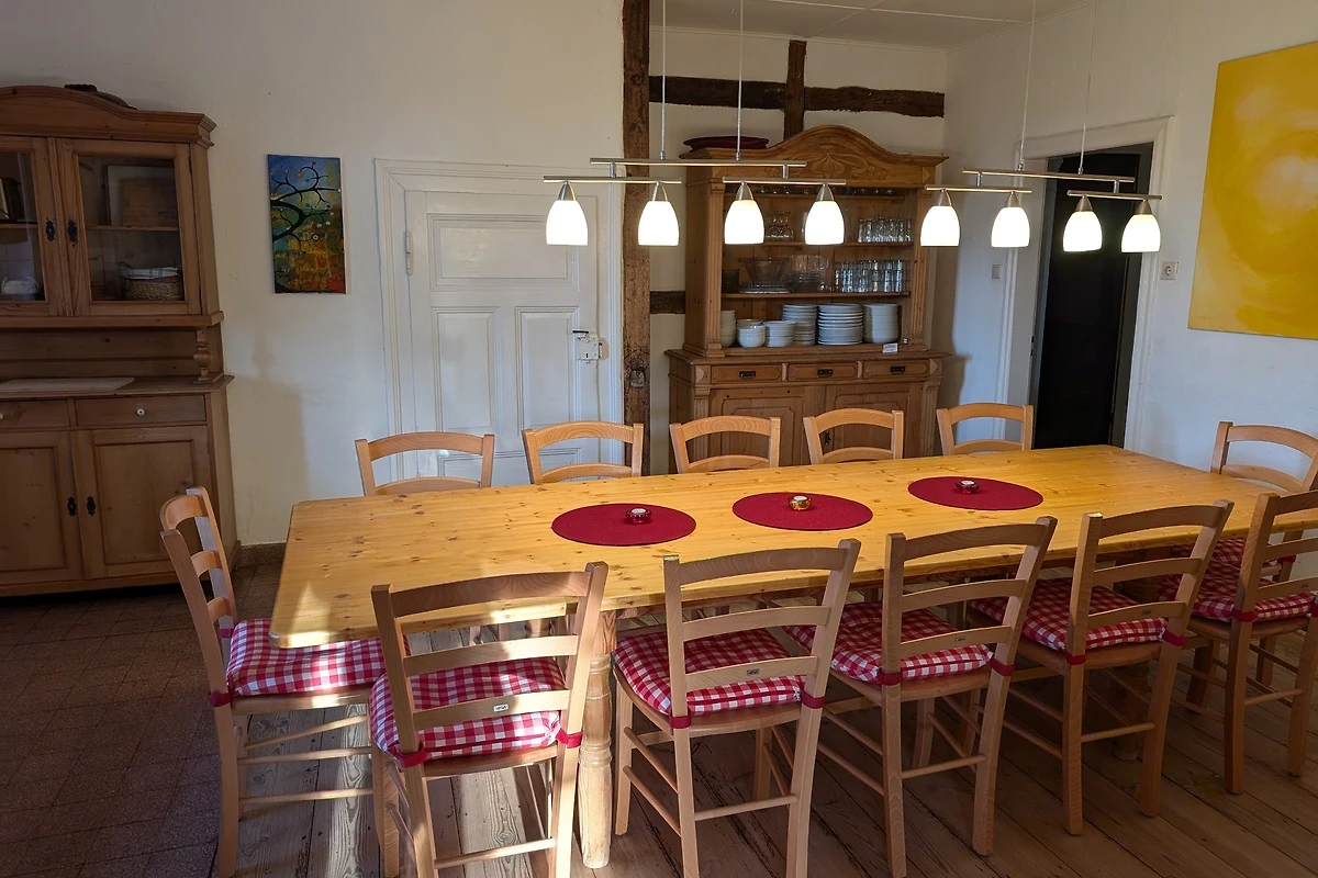 Willkommen im Gästehof Brockum – Ihrem großzügigen Feriendomizil für bis zu 18 Gäste auf 215 m² Wohnfläche. Hier finden große Familien, Freundesgruppen oder Monteure viel Platz und Komfort. Fünf Schlafzimmer und zwei Badezimmer sorgen für entspannte Nächte und einen erholsamen Start in den Tag. Im Gruppenraum steht eine Tischtennisplatte bereit. 2 weitere Schlafmöglichkeiten sind ebenfalls vorhanden. Die Ferienwohnung ist hundefreundlich, sodass auch Ihr Vierbeiner willkommen ist. Im weitläufigen Garten mit Terrasse und Grill und einem historischen Backhaus mit Steinbackofen genießen Sie gesellige Stunden, während Kinder sicher spielen können. Die Küche ist mit einer Küchenzeile, Cerankochfeld, Backofen, Geschirrspüler, Wasserkocher, Kaffeemaschine, Toaster und ausreichend Geschirr bestens ausgestattet. Kühlschrank, Gefrierschrank und Mikrowelle finden Sie in der Vorratskammer neben der Küche. Für gemütliche Abende sorgt der Kamin, während TV, HiFi-Anlage, Radio, Fernseher und WLAN für Unterhaltung sorgen. Zwei Kinderreisebetten und 2 Hochstühle stehen bereit, ebenso wie Föhn, Waschmaschine und Staubsauger. Ein Parkplatz sowie eine Wallbox für E-Autos sind vorhanden. Die Wohnung ist nur für Nichtraucher geeignet und bietet ein allergikerfreundliches Umfeld. Auch für längere Aufenthalte ist der Gästehof eine ideale Wahl.