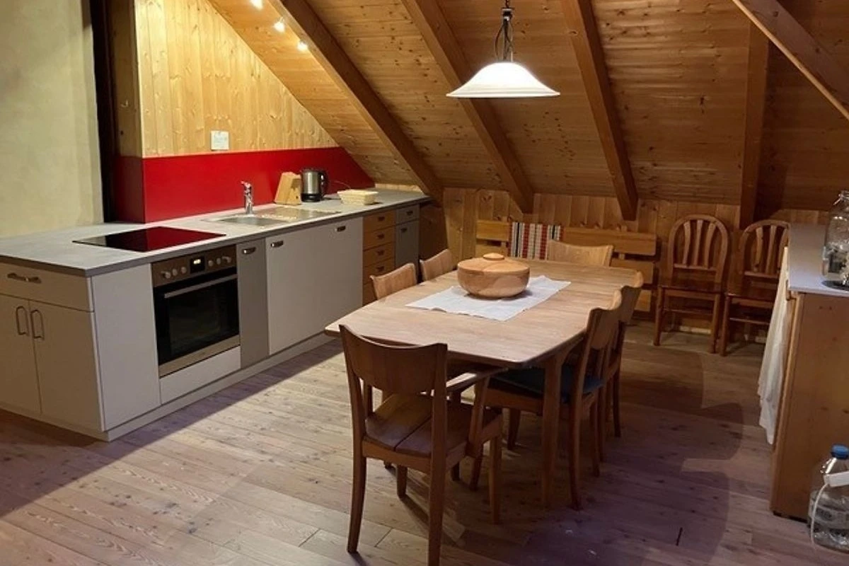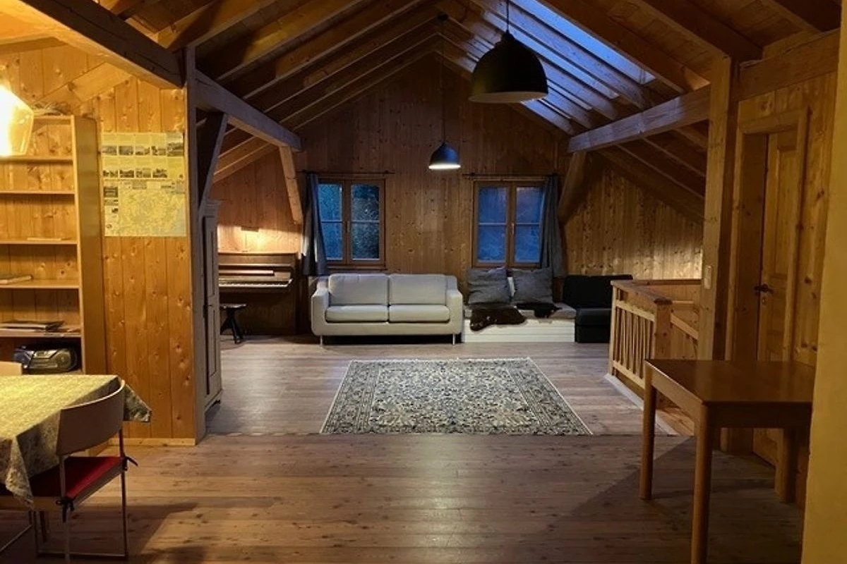 Der offene Wohn- und Essbereich ist gemütlich gestaltet und lädt zum Verweilen ein. Ein Klavier steht Gästen zum Musizieren zur Verfügung und unterstreicht den besonderen, kreativen Charakter der Unterkunft.