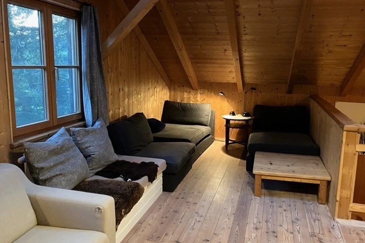 Die Ferienwohnung befindet sich im Obergeschoss der Hütte im Moor und bietet viel Raum, Licht und eine besondere Atmosphäre – ideal auch für kreative Tätigkeiten.
