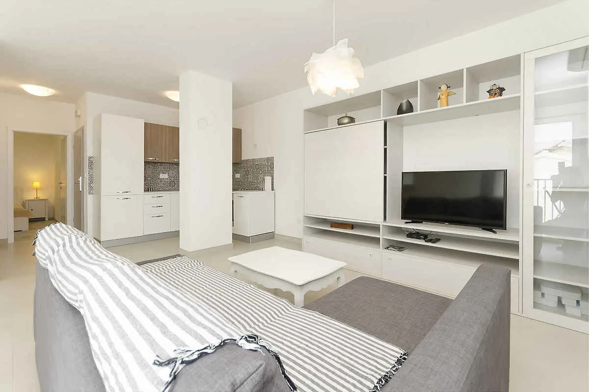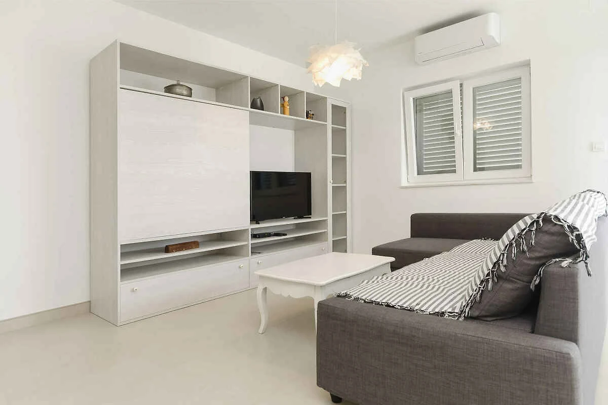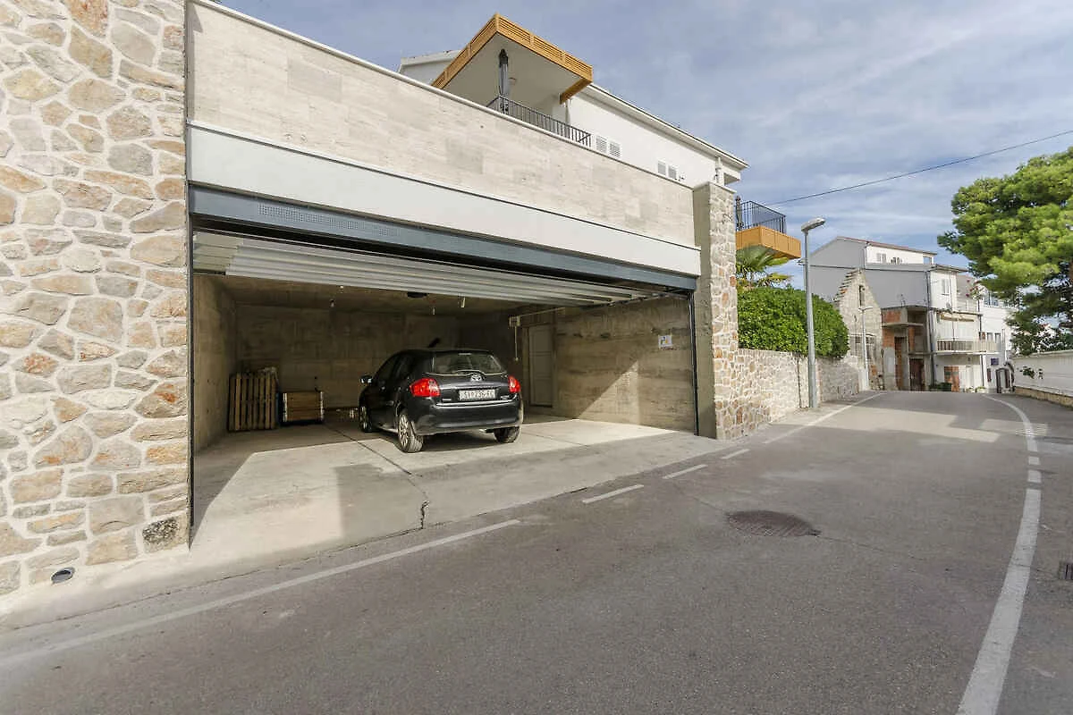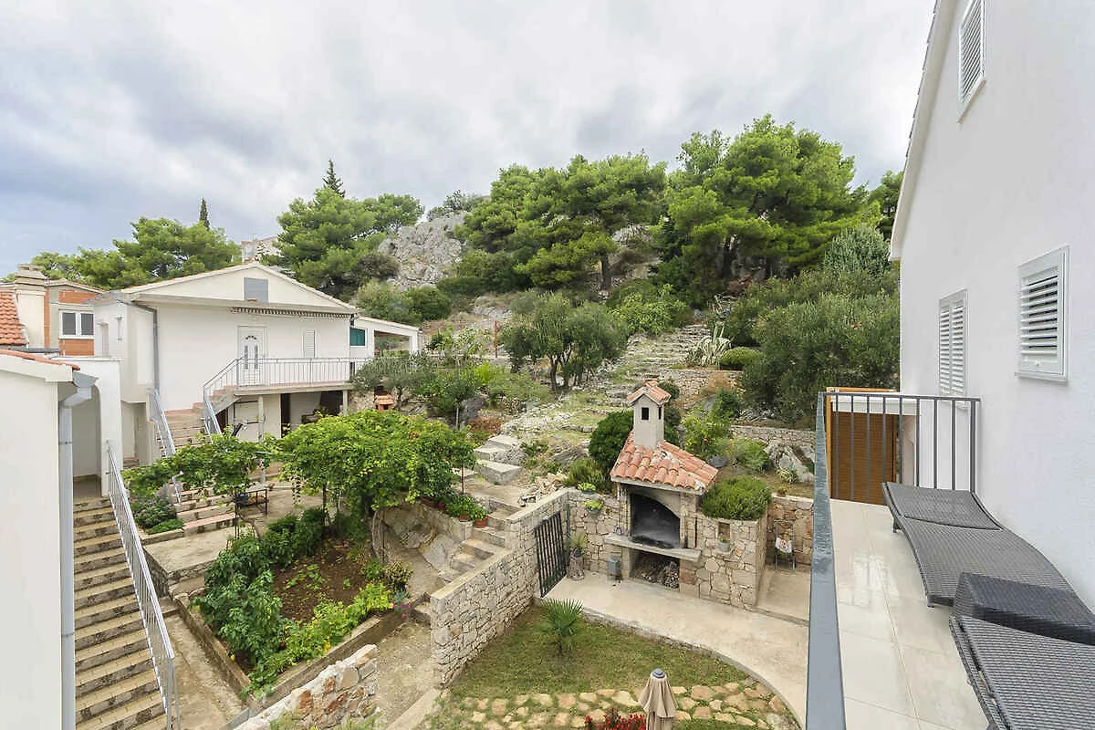 Tribunj. Die Ferienwohnung befindet sich in einer Ferienanlage, auf einem offenen Gartengrundstück mit Sträuchern und Bäumen. Die Zufahrt erfolgt über eine Nebenstrasse (asphaltiert). Parkplatz in Garage und auf dem Grundstück.