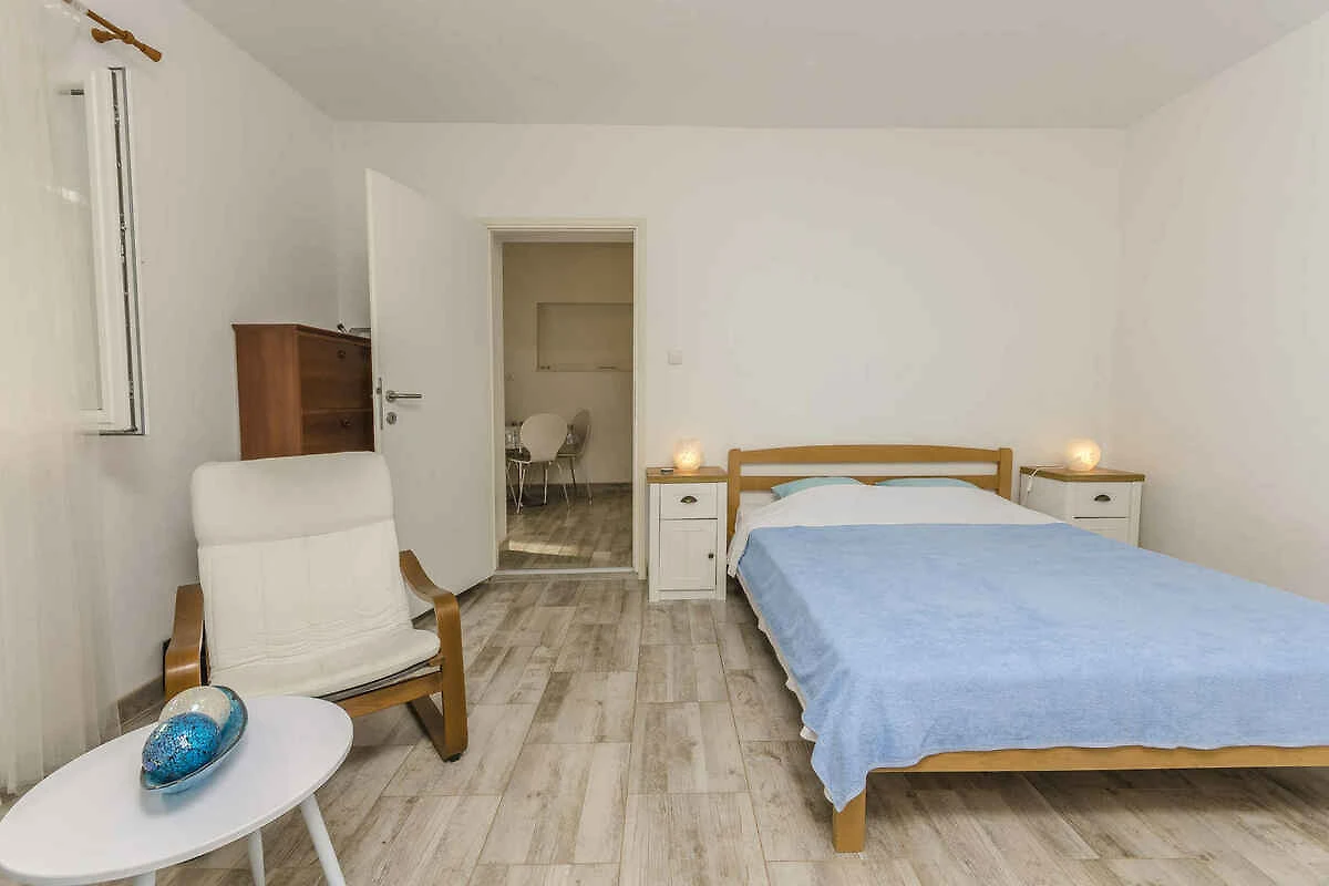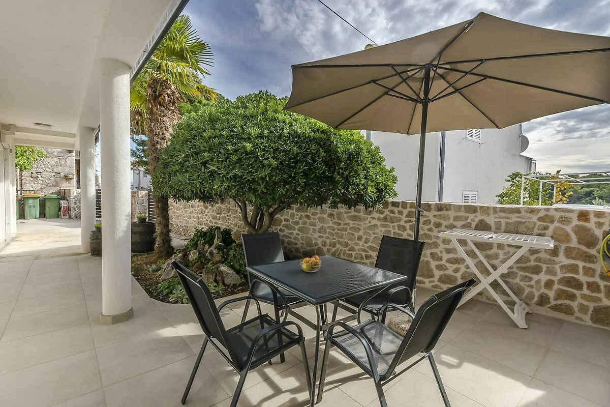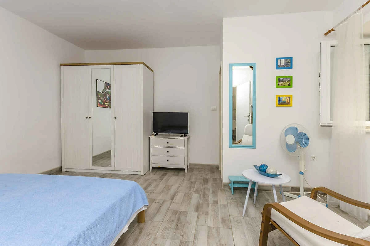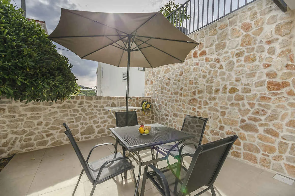Tribunj. Die Ferienwohnung befindet sich auf einem 50 qm grossen Grundstück. Der Vermieter wohnt nur zeitweise im Haus, nutzt jedoch einen separaten Eingang. Blick auf den Garten. Die Zufahrt erfolgt über eine Nebenstrasse (asphaltiert). Parkplatz in Garage und auf dem Grundstück und der Strasse vor dem Haus.