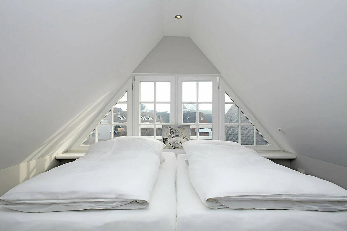 Im ausgebauten Dachgeschoss entspannen Sie sich in einem weiteren, gemütlichen Schlafzimmer mit herrlichem Blick Richtung Strand und Dünen.
