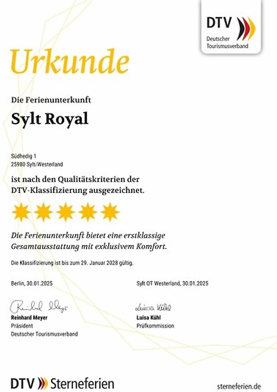 «Sylt-Royal» erreicht eine Urlauberbewertung von 5 (Bewertungsskala: 1 bis 5) bei 6 abgegebenen Bewertungen.