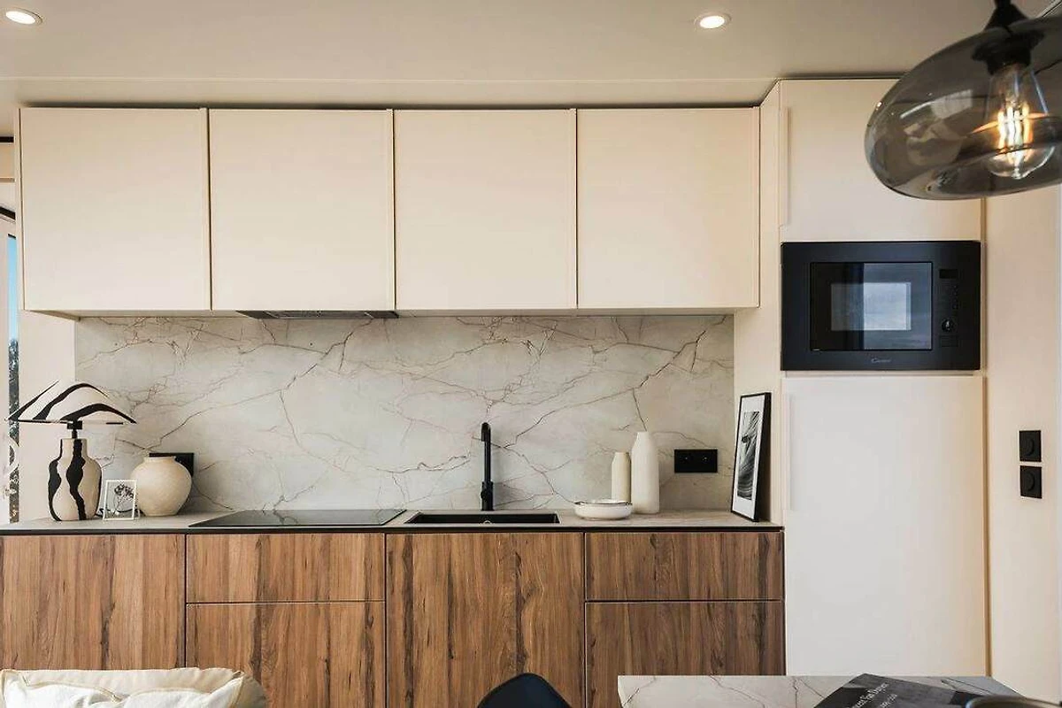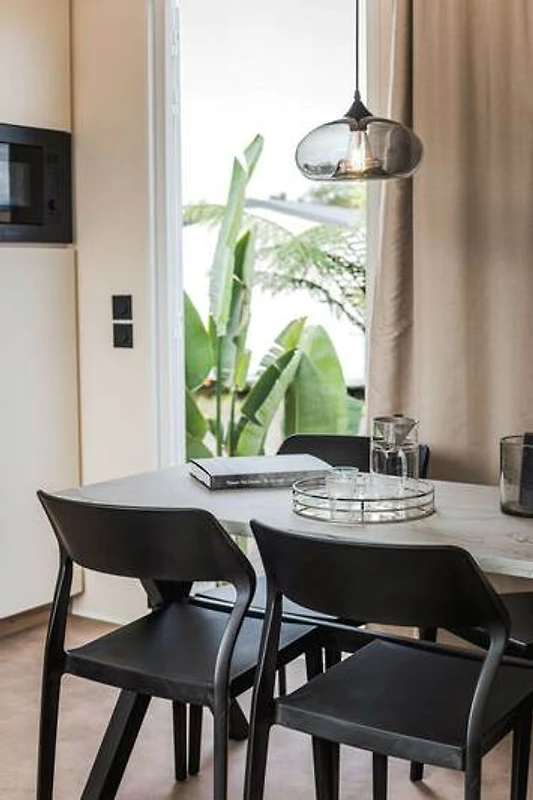 Im offenen Wohnbereich genießen Sie gesellige Stunden auf einer komfortablen Couch, während Sie den Fernseher oder das kostenfreie WLAN nutzen. Die Küchenzeile ist mit Geschirrspüler, Mikrowelle, Wasserkocher und Kaffeemaschine ausgestattet – so wird das Zubereiten gemeinsamer Mahlzeiten zum Vergnügen. Der Essbereich mit natürlichem Holz und viel Licht schafft eine angenehme Atmosphäre für Frühstück und Abendessen.