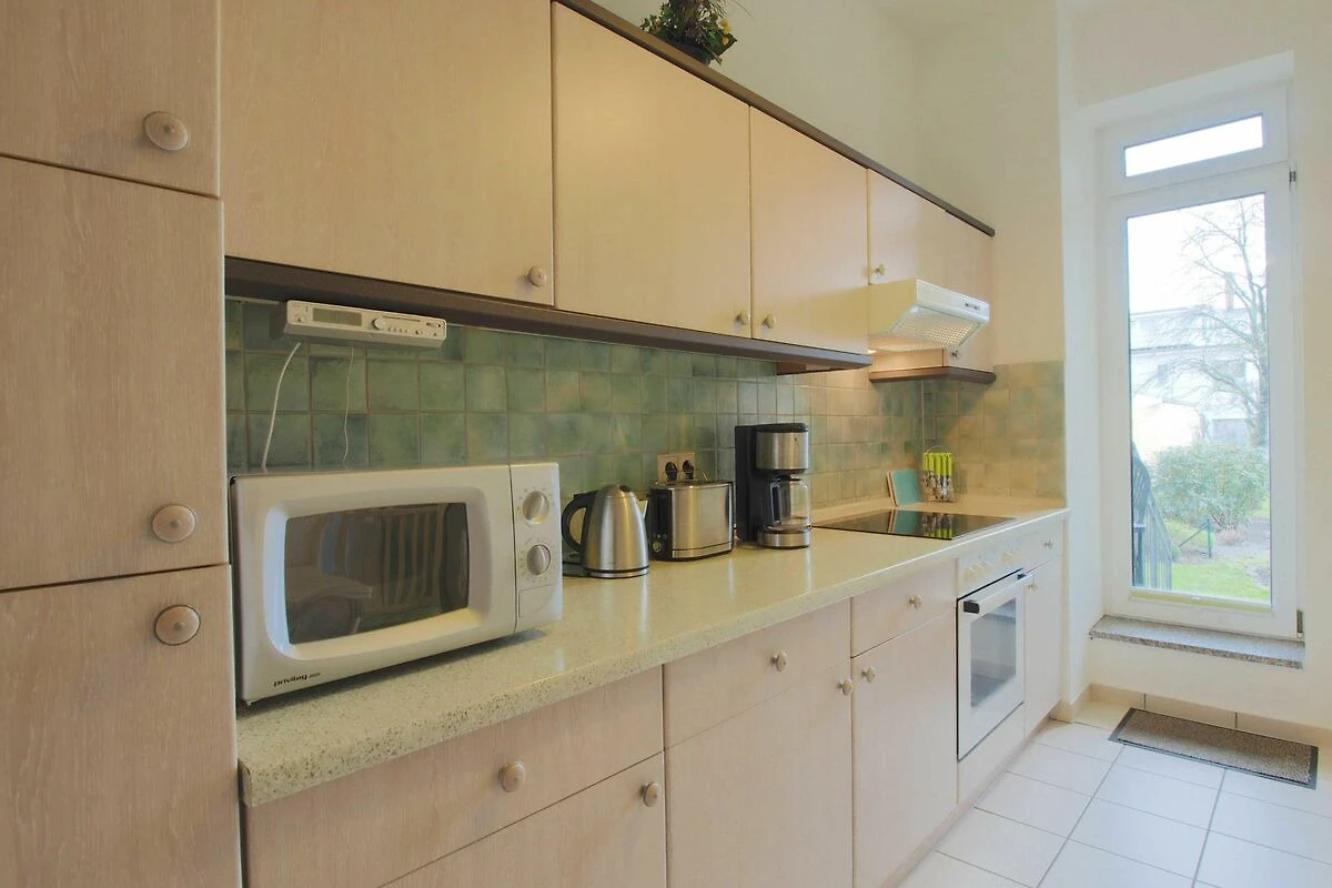 Die gut ausgestattete Küche mit Essecke bietet alles, um gemeinsam zu kochen und den Tag gemütlich zu starten. Von hier aus gelangen Sie direkt auf den Balkon mit Zugang zum Garten – perfekt, um bei einer Tasse Kaffee die frische Seeluft zu genießen.