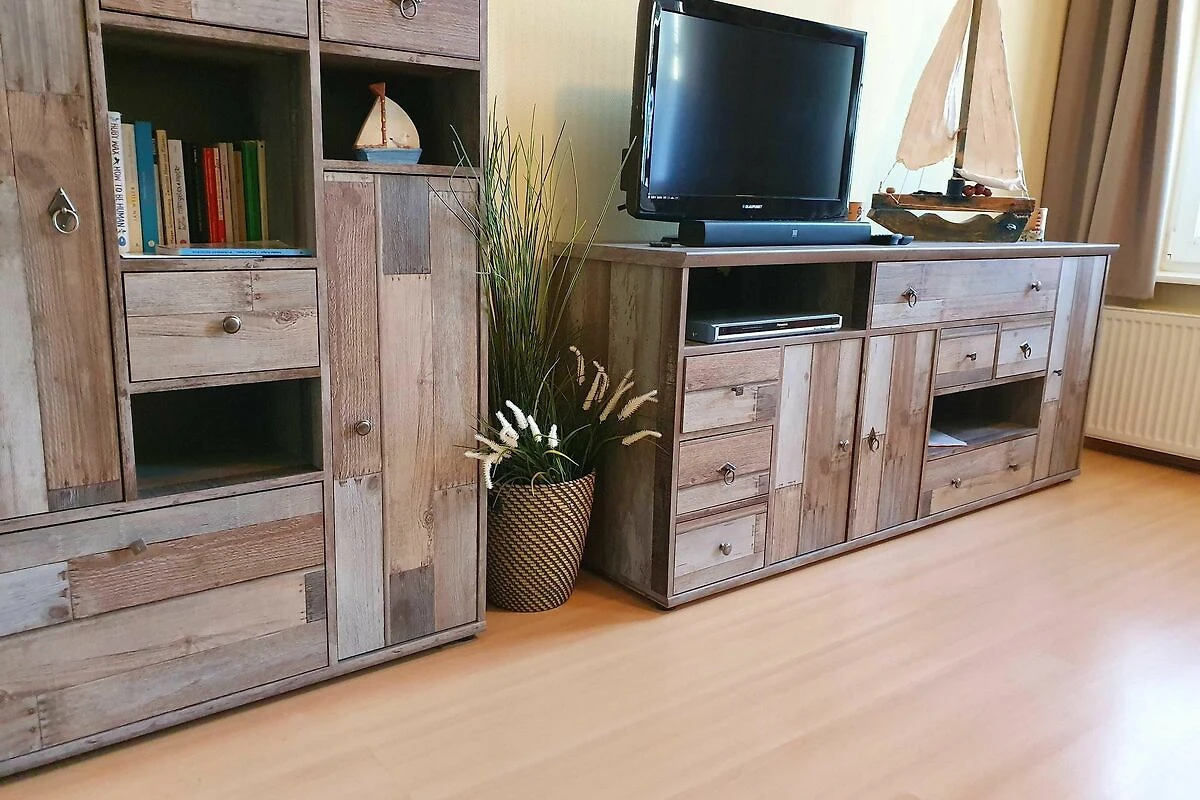 Im gemütlichen Wohnzimmer erwartet Sie ein Flachbild-TV sowie eine bequeme Schlafcouch, die sich perfekt für zusätzliche Gäste eignet. Das Schlafzimmer mit komfortablem Doppelbett lädt zu erholsamen Nächten nach einem Tag am Meer ein.